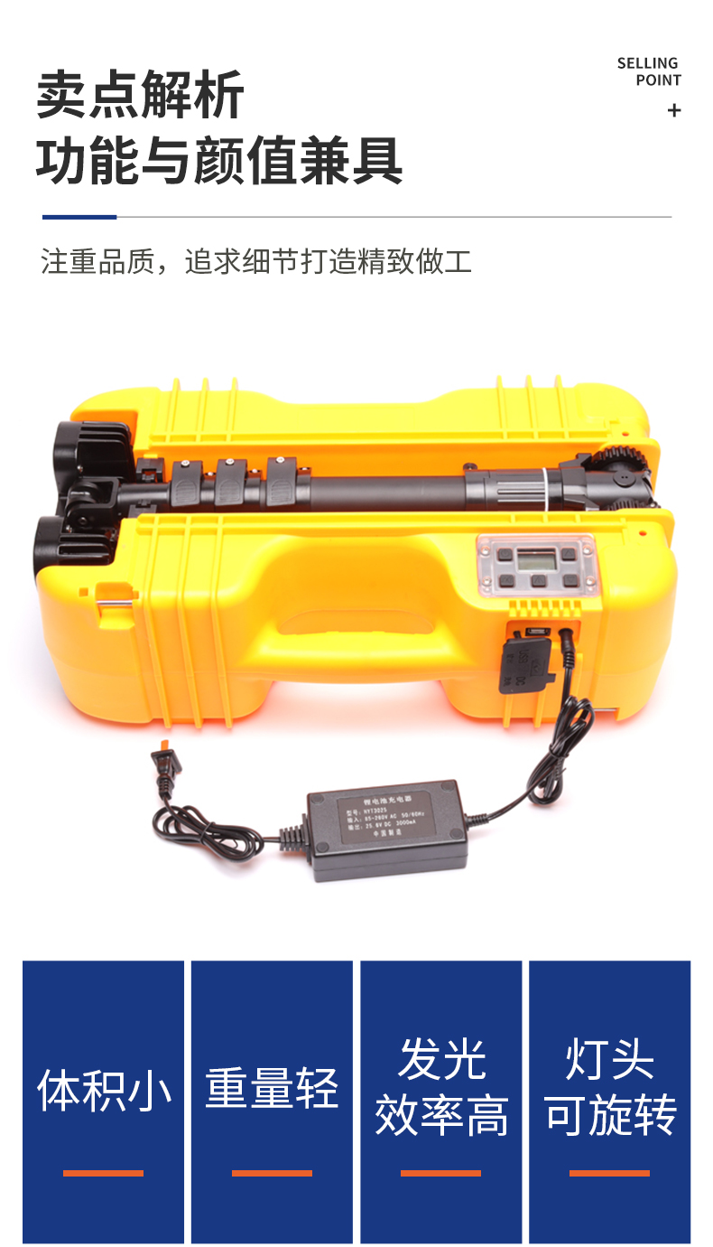 该产品体积小、重量轻,携带方便可手提、背行两种方式。采用国际品牌LED光源,发光效率高,使用寿命长达10万小时。超低功耗,强光可连续工作8小时以上,泛光达到12小时,聚光达到16小时,照明亮度可进行10%-100%无极调光匹配现场使用。灯头背部设置有红黄双色警示灯,可通过灯具上的按键进行警示灯模式调节。灯头采用四节升降杆固定,最大升起高度可达1.5米,且灯头可进行水平360°旋转,垂直180°旋转调节,满足各种情况下的照明需求。该产品适用于铁路、电力、公安、消防、事故抢修及其他工作现场的临时照明。