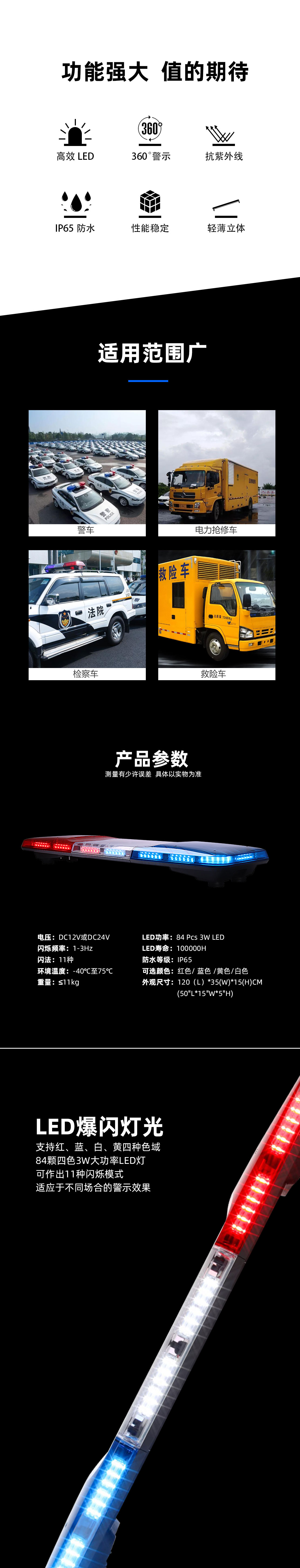 TBD-A2系列长排警示灯是我公司自主设计开发的超薄中高端产品,外形设计新颖具有较强的科技感,整体效果充分显示了警车的威严与庄重。在道路交通行驶中以警示过往行人、车辆避让和遵守交通等行为。