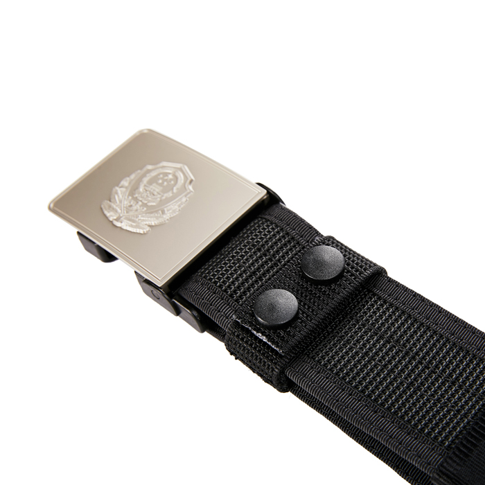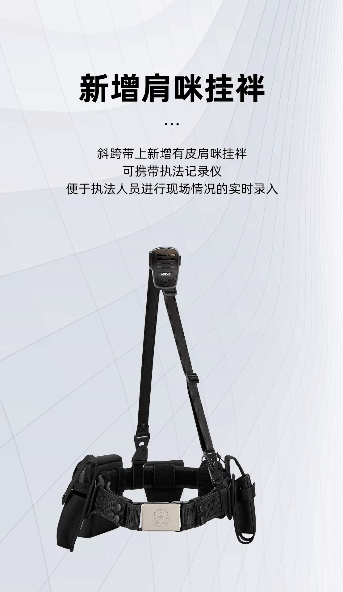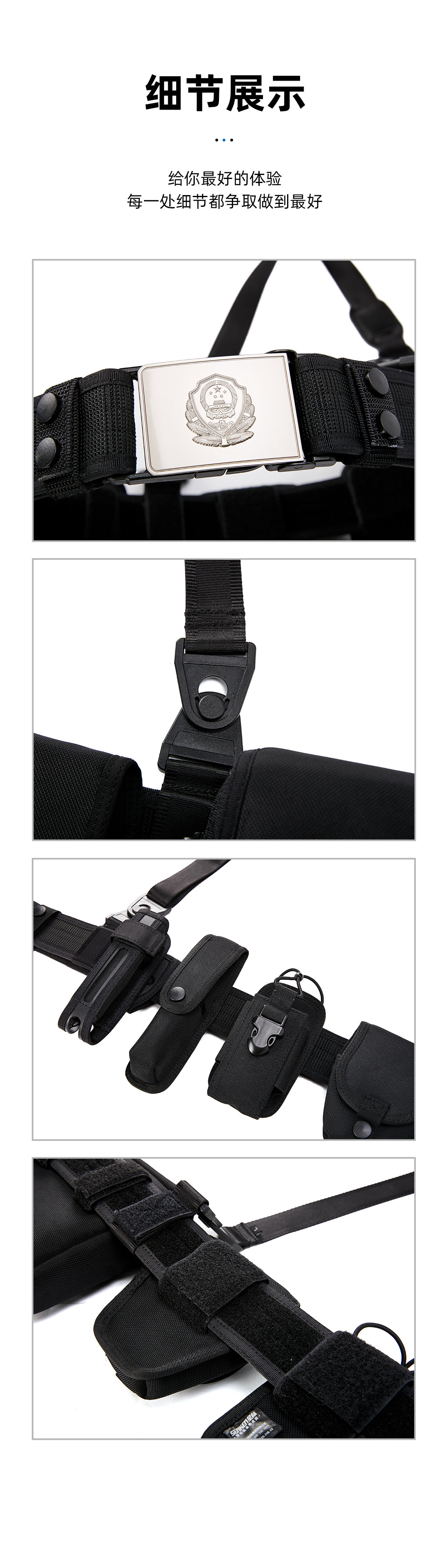 该款腰带是根据执法人员实际使用情况新研发生产的腰带。腰带主体一般采用尼龙编织,其由腰带扣头钎子、内腰带、带体、斜挂带和五个装具套(手铐套、强光手电套、警用工作包、快拔警棍套快拔、便携警棍套、催泪喷射器套、装具套可单独拆卸)组成,装具套后袢与腰带采用滑动式和固定式两种可拆卸式结构。可调整长度及组件位置,具有透气性好,易洗快干,穿着舒适。所有套具均做轻量化设计,整体重量减轻,适合长时间挂载执勤、巡逻、围捕等实战使用。