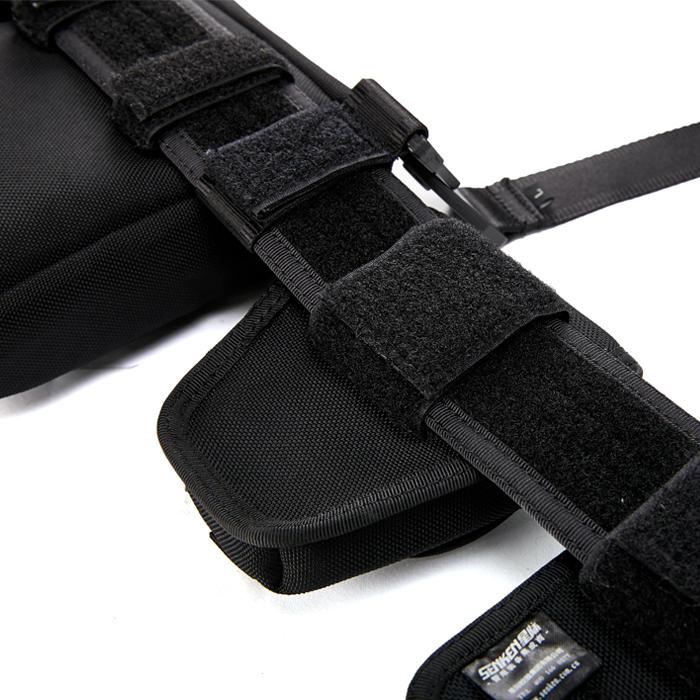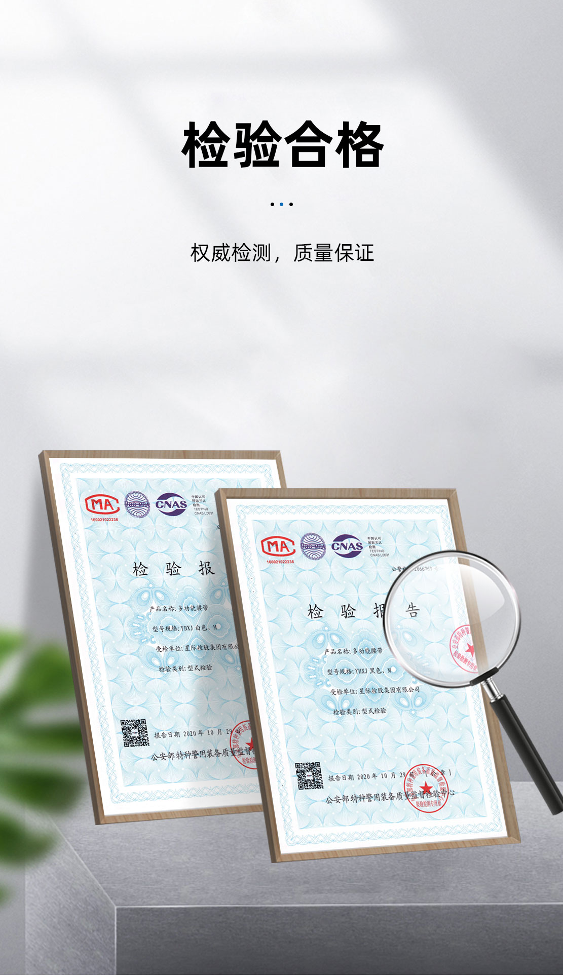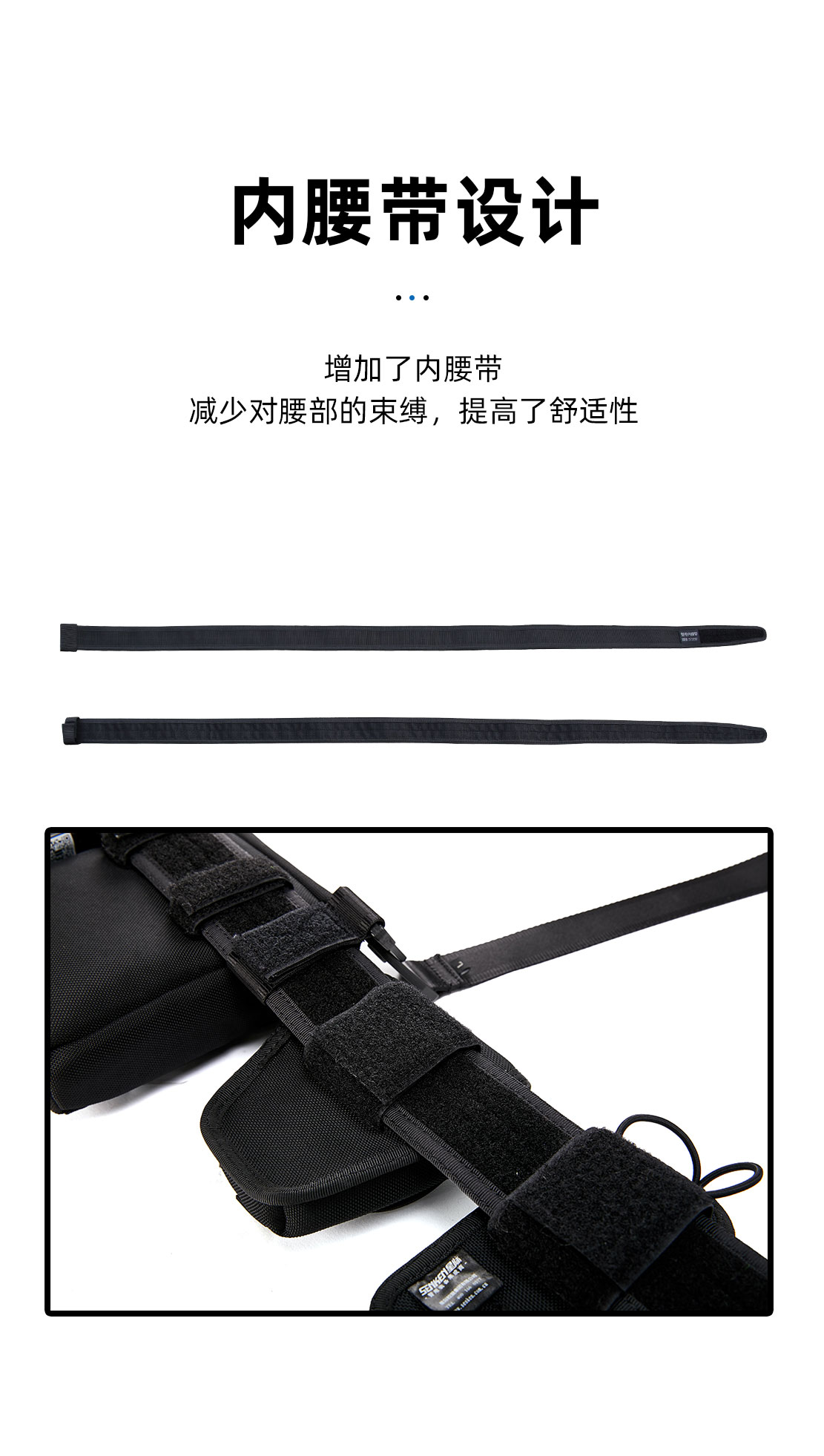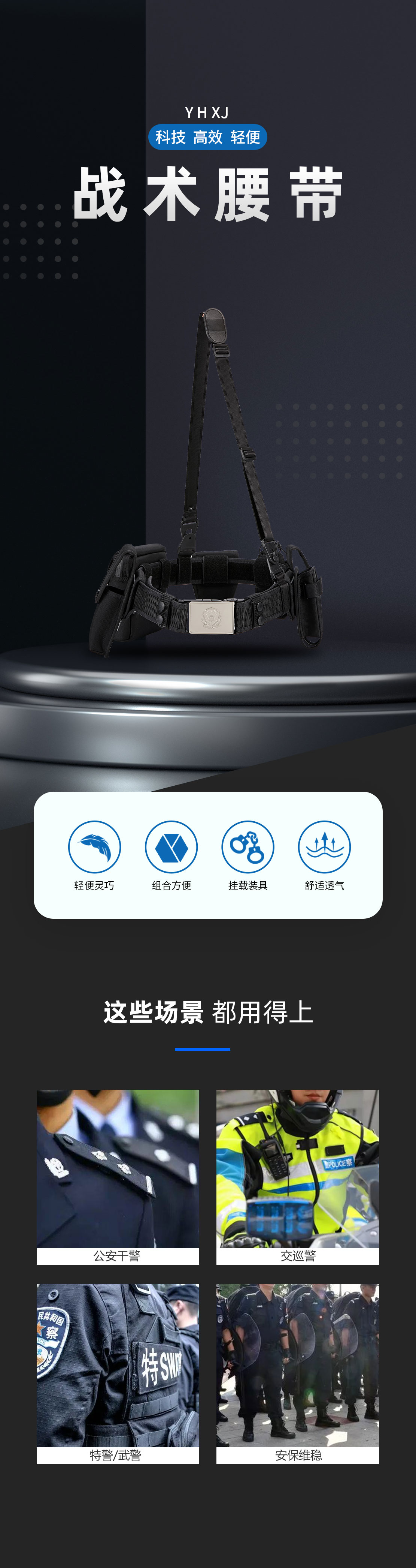 该款腰带是根据执法人员实际使用情况新研发生产的腰带。腰带主体一般采用尼龙编织,其由腰带扣头钎子、内腰带、带体、斜挂带和五个装具套(手铐套、强光手电套、警用工作包、快拔警棍套快拔、便携警棍套、催泪喷射器套、装具套可单独拆卸)组成,装具套后袢与腰带采用滑动式和固定式两种可拆卸式结构。可调整长度及组件位置,具有透气性好,易洗快干,穿着舒适。所有套具均做轻量化设计,整体重量减轻,适合长时间挂载执勤、巡逻、围捕等实战使用。