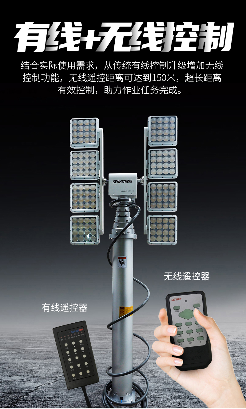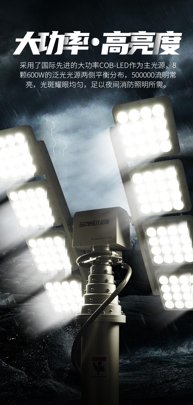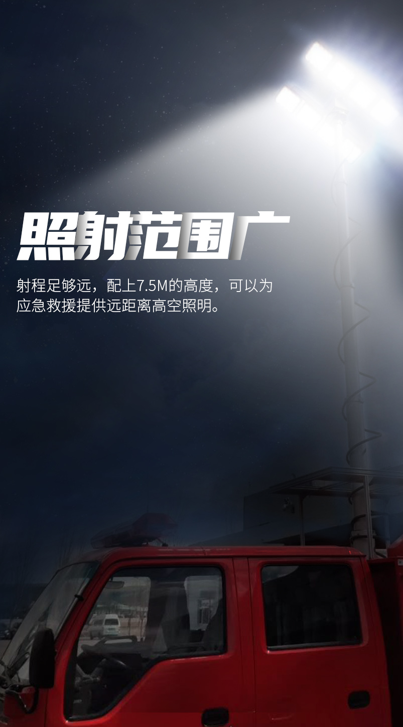 SG75-8600X消防移动式照明装置是专业为消防照明车设计,自主研发的夜间应急照明系统,具有升降、旋转的照明功能,采用前沿设计理念和制造工艺,采用了国际先进的大功率COB-LED作为主光源,灯具光学由专业光学团队专利设计。