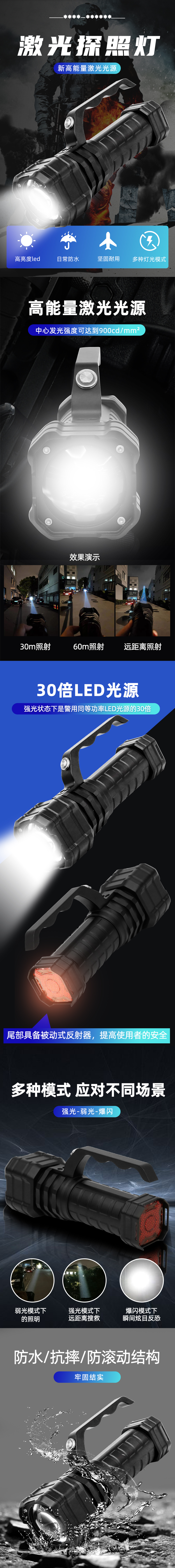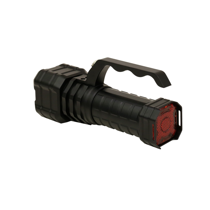 激光搜索灯,功能多样,具备强光、工作光、爆闪三种调光模式;以适用于强光模式下远距离搜救,爆闪模式下瞬间炫目反恐,工作光模式下的照明及尾部的安全警示与位置标识。