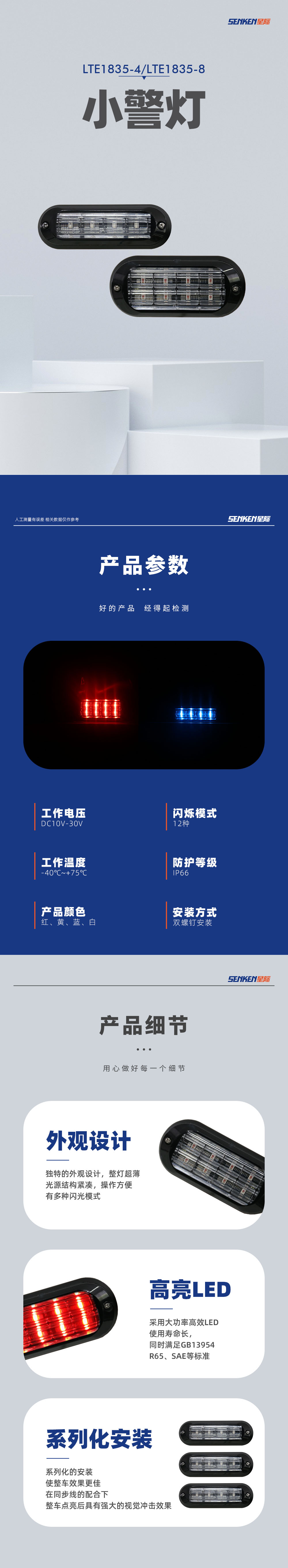 LTE1835警示灯采用大功率高效LED,使用寿命长,同时满足GB13954、R65、SAE等标准。.独特的外观设计,整灯超薄,光源结构紧凑,操作方便,有多种闪光模式。同时具备红、蓝、黄、白多种灯珠颜色选择,以及4灯珠、6灯珠、8灯珠共3款型号自由搭配选择,能满足更多车型的更多部位进行安装。系列化的安装,使整车效果更佳。在同步线的配合下,整车点亮后具有强大的视觉冲击效果。
