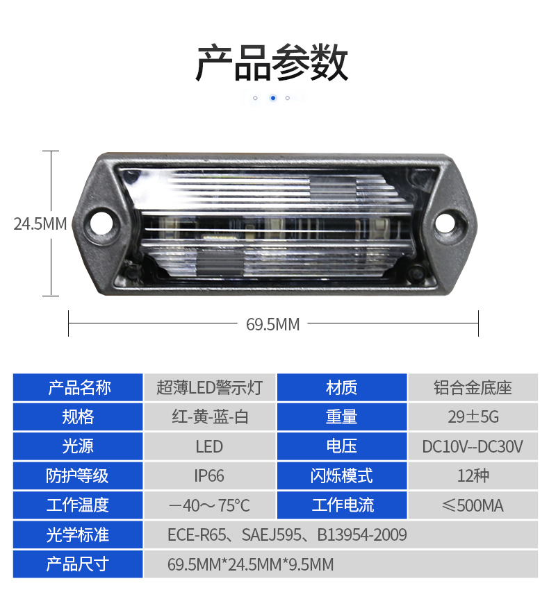 LTE2015警示灯产品体积小、易安装,多种可定制闪烁模式结合超薄外观达到与车身的完美结合;产品表面处理采用专业喷砂制作工艺,搭配多种外观颜色,使产品效果更丰富;产品主要适用车型轿车、城市小型SUV等车辆安装应用。