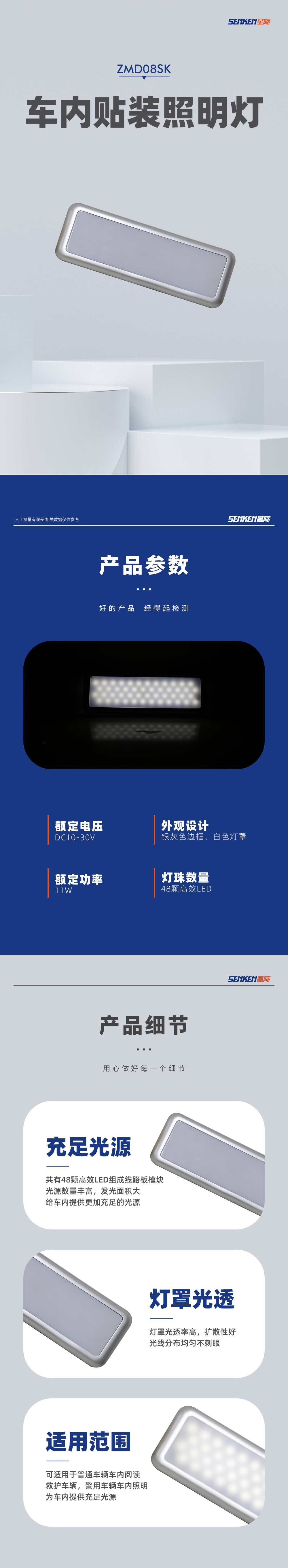 ZMD08SK是我公司以超薄、LED数量丰富为主打的一款照明灯,可适用于普通车辆车内阅读,救护车辆,警用车辆车内照明,为车内提供充足光源。适用于所有车辆内部安装。