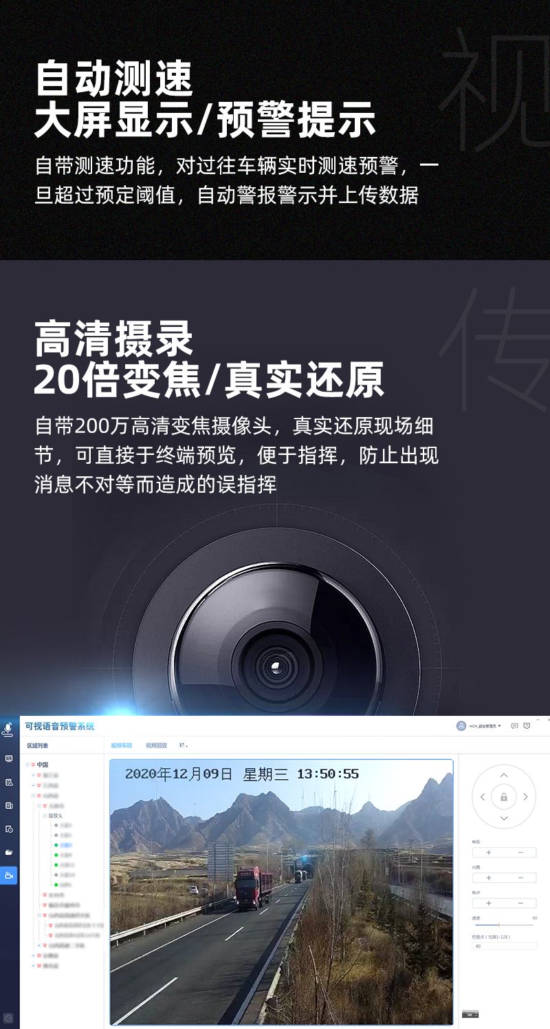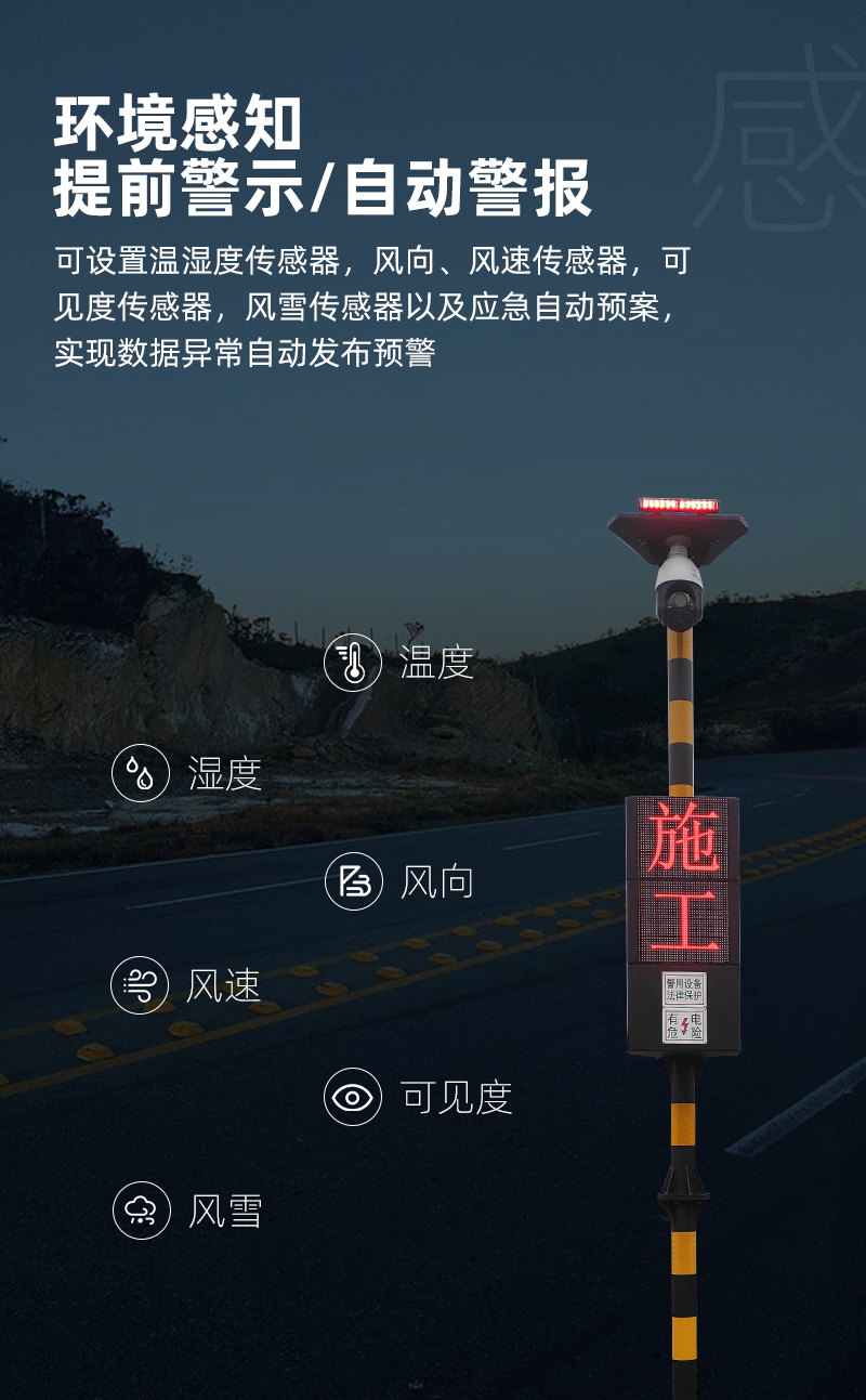具有远程预警控制,显示屏信息发布,带警灯提示,带喇叭预警,带摄像取证,带红外感知功能。主要可用于交通执法、交通预示、监狱、治安、等场所指挥;也可用于高速道路疏通、警示、预警、交通检查、森林防火、大型水库险情、监狱等场所作广播、警报设备之用(具体功能有所不同)。