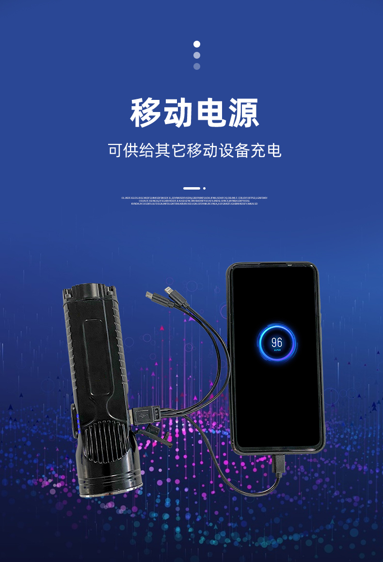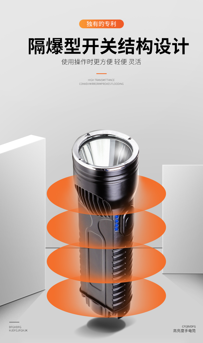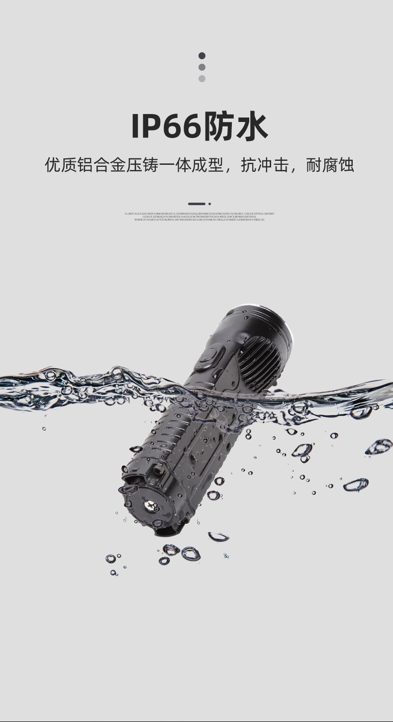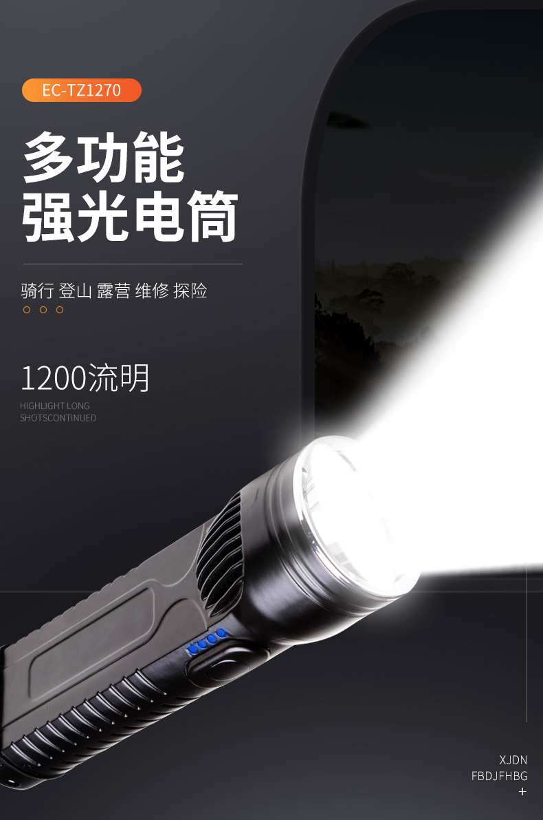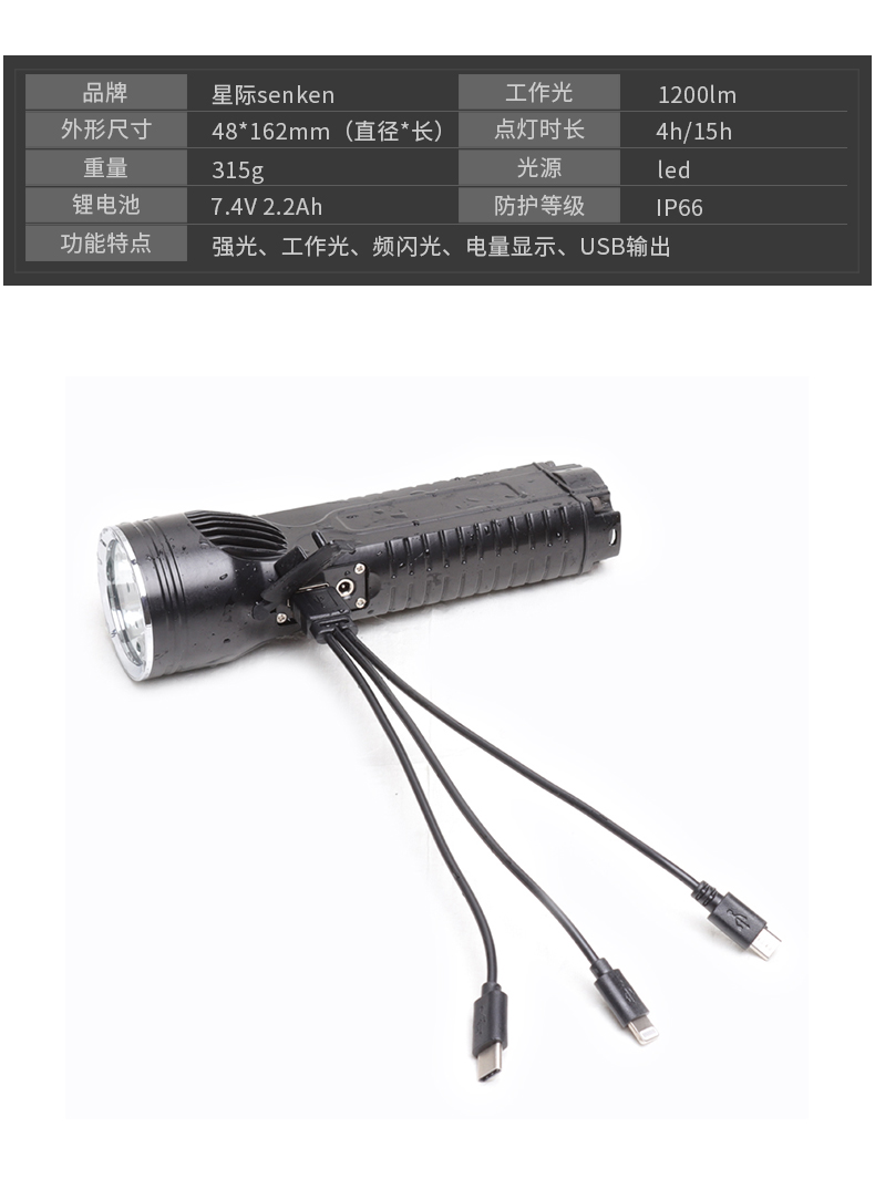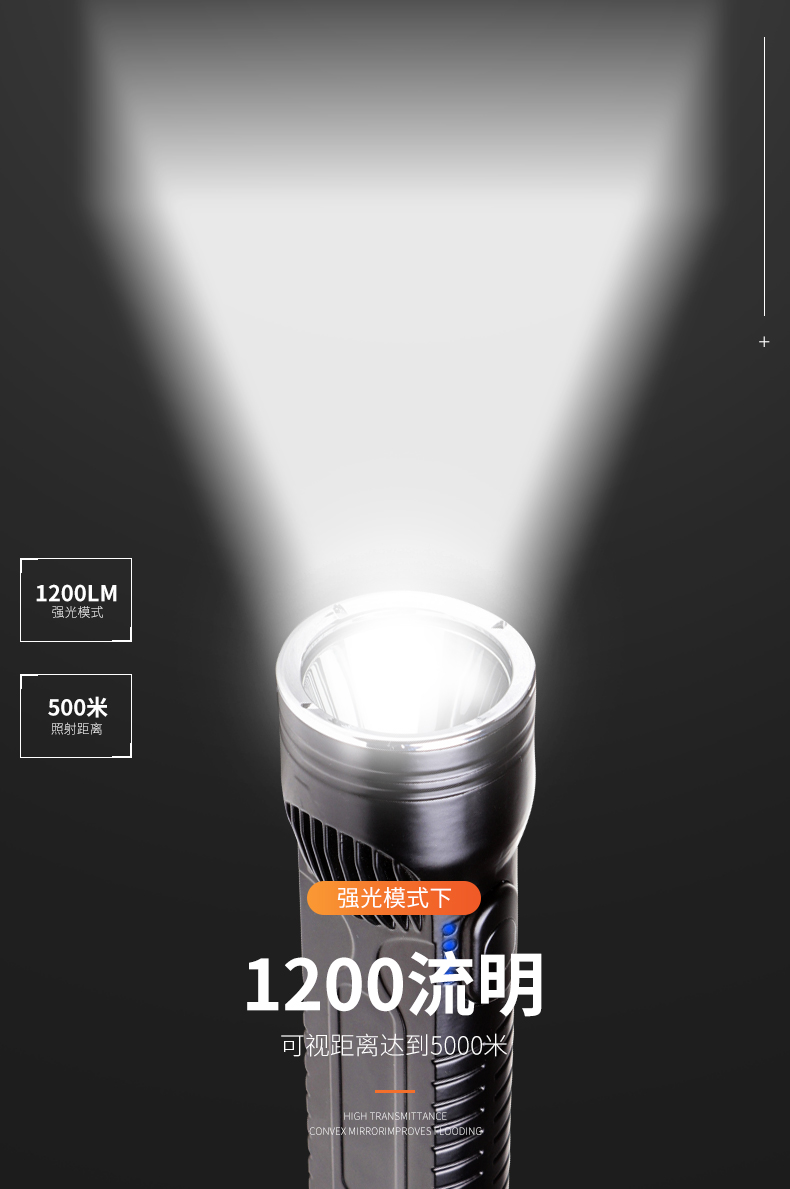 外壳采用严选铝合金压铸一体成型,抗冲击,耐腐蚀,适合在多种场所用。采用单片机编程控制技术,强光光通量1200流明,照射距离达到500米以上,可视距离达到5000米,工作光可连续照明15个小时以上。