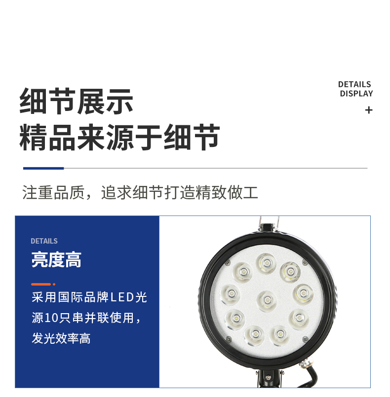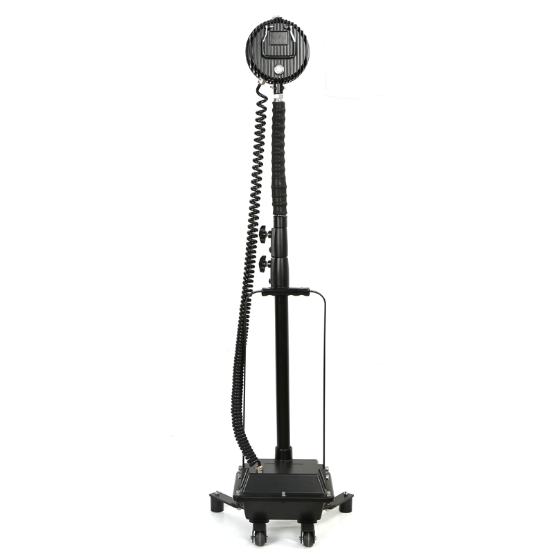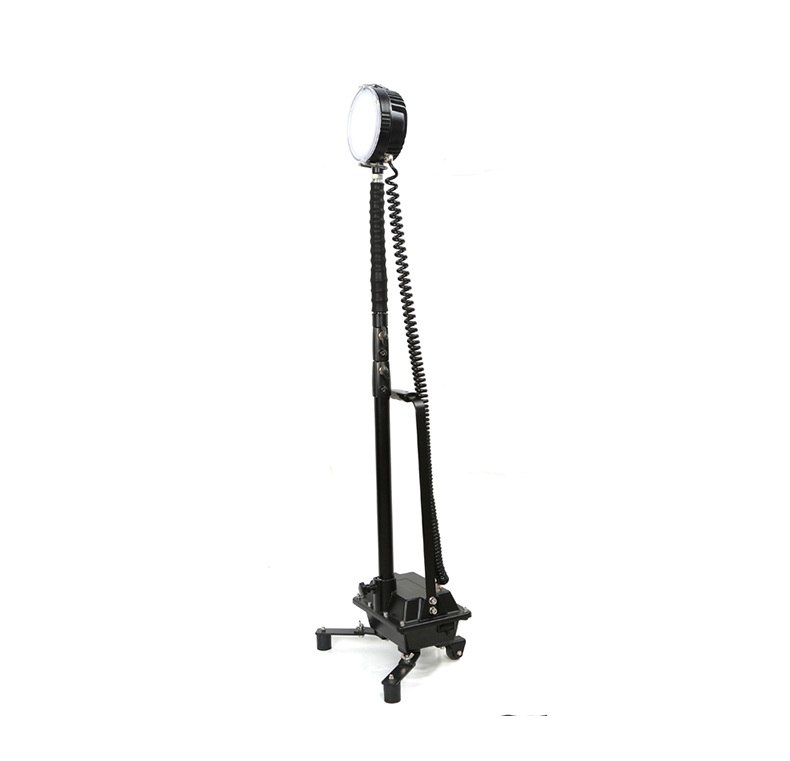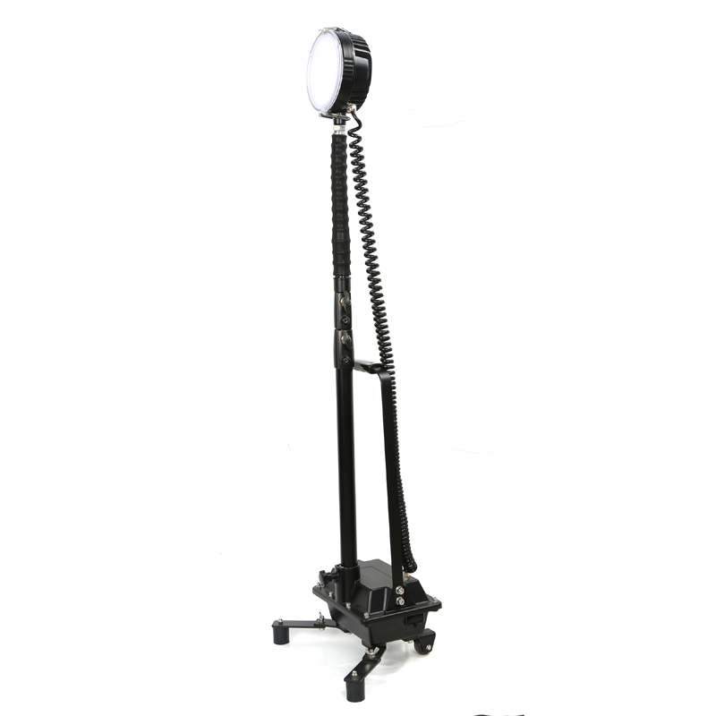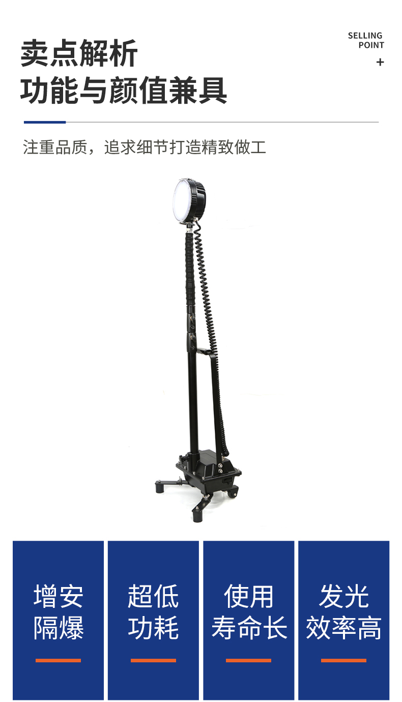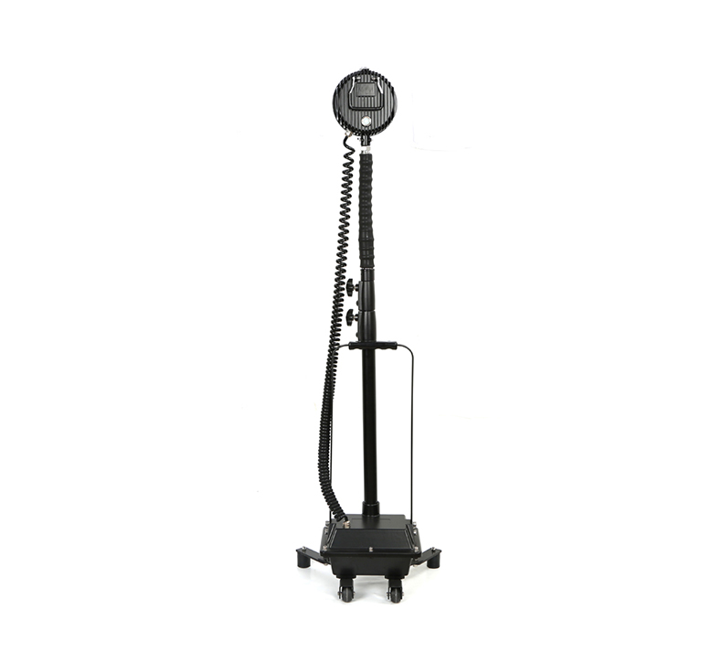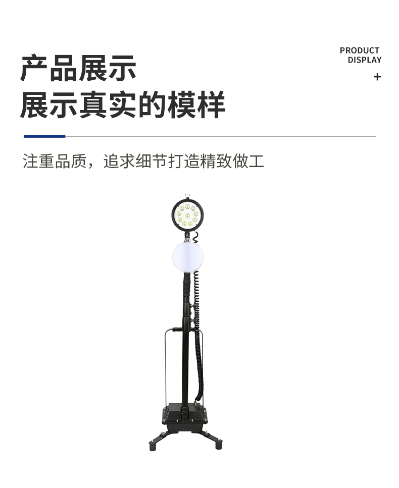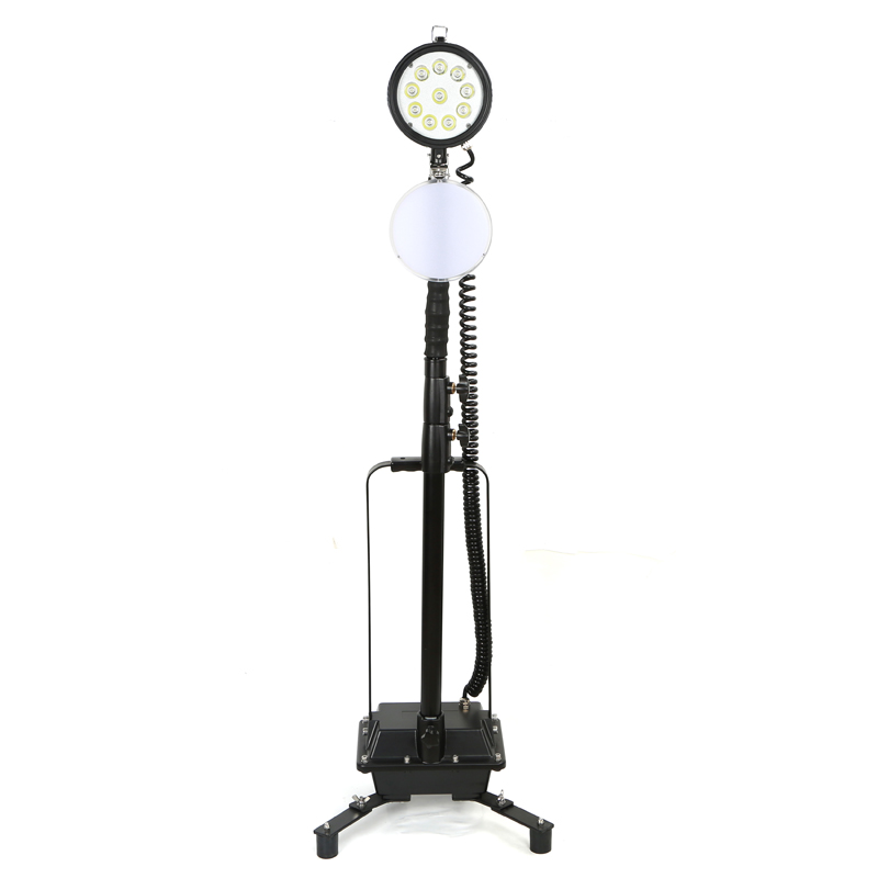 独特的灯头结构设计,可聚光远距离照明使用,也可轻松转换成泛光大面积施工照明使用,灯头实现了照射方向万向无级可调。升降杆和电池箱为一体式结构,使用方便灵活,灯体底部装有方便移动的轮子,可在平地上轻松移动灯体位置。