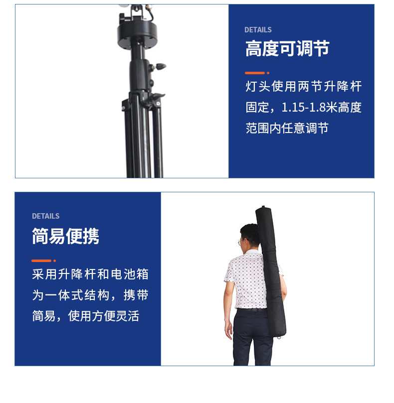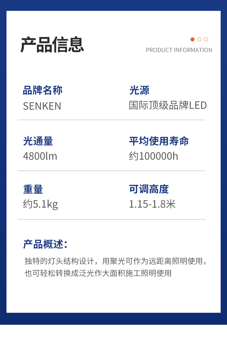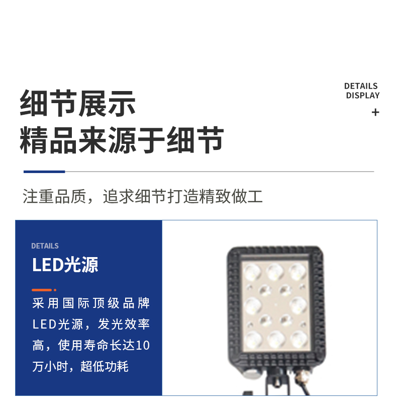 独特的灯头结构设计,用聚光可作为远距离照明使用,也可轻松转换成泛光作大面积施工照明使用。安全性、人性化设计照明灯头背面设置有红黄蓝警示灯,在使用现场可有效对来往车辆起到警示作用,保持现场作业人员的安全性。