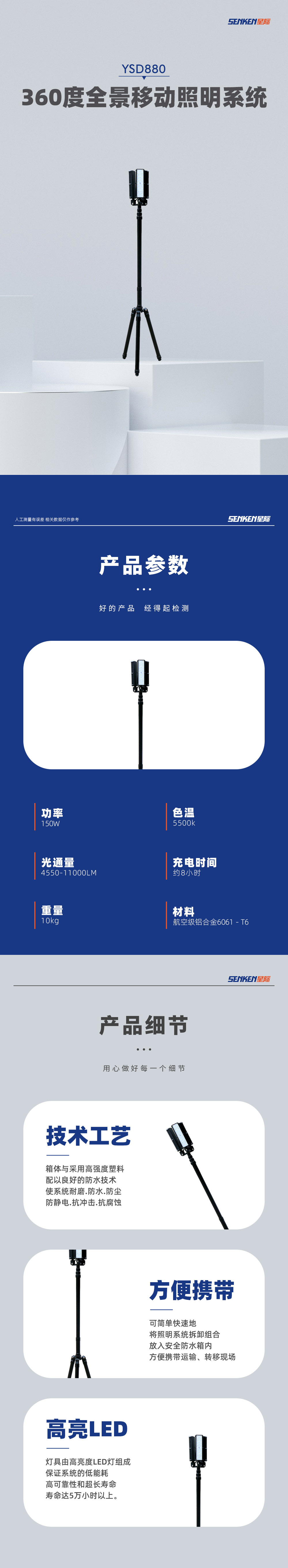 该产品360°无死角全景照明,亮度高达11000lm,最大照明范围可达半个篮球场以上,外观精美便携,单手可提,适用铁路、电力、公安、航运、消防、工矿企业及各种野外工作照明和信号指示。