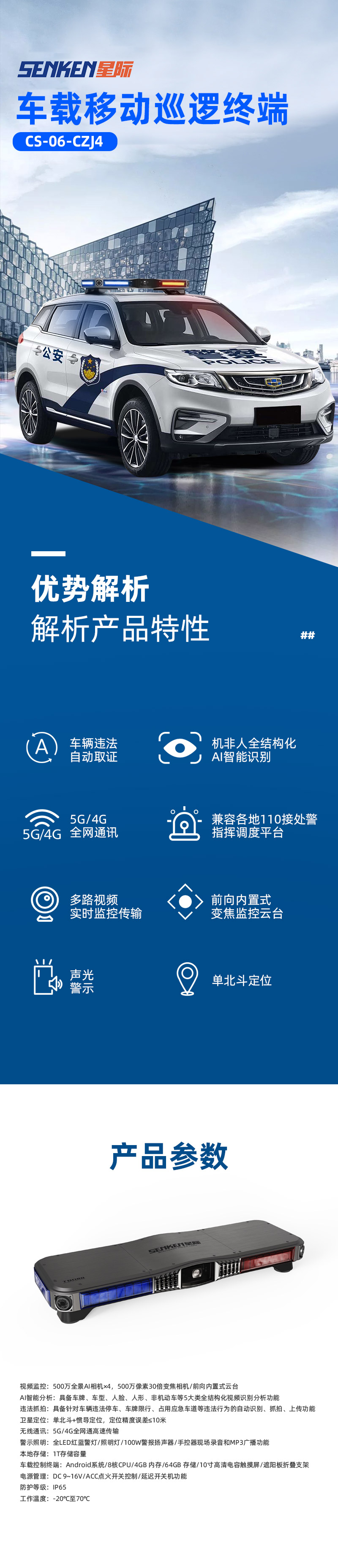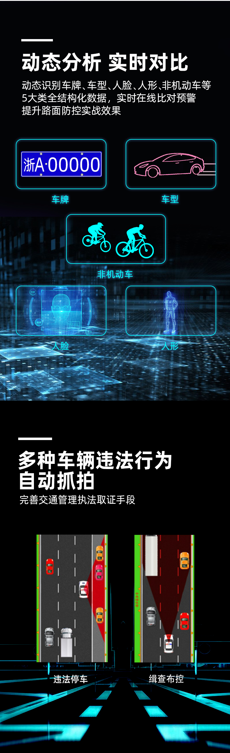 第四代车载移动巡逻终端集警务调度、动态执法取证、纠违稽查、监控传输、声光警示为一体,可以自动识别经过的车牌、车型、人脸、人形、非机动车等5大类目标特征,通过与公安平台数据库比对后,能将比对成功的预警信息下发到车载前端设备中,实现对车辆和人员的移动缉查布控功能。能对交通违法行为中的违法停车、车牌限行等多种违法行为实现自动抓拍。同时借助5G/4G无线传输、单北斗+惯导定位等功能实现高效快速的警务调度,远程指挥,提高执法效率。