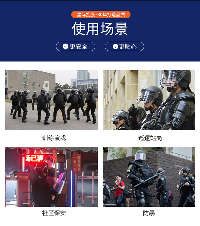 警用防暴头盔是一种保护警务人员在执行公务时抵御头部及面部受到打击伤害或其它潜在的伤害(如泼洒腐蚀性化学液体)的一种警用装具。其壳体按公安部防暴头盔标准壳型设计,并采用 PC 合金制造,具有质轻、强度高,外形美观、线条流畅,面罩镜片透光率好,视野开阔、佩戴舒适、牢靠、穿脱简便等优点是警务人员在反恐反暴斗争中为保障自身安全必备的防护用品。
