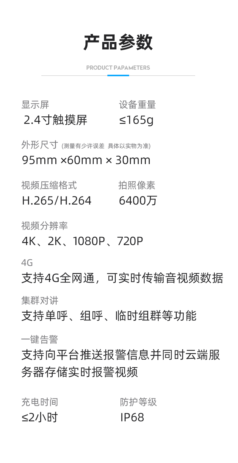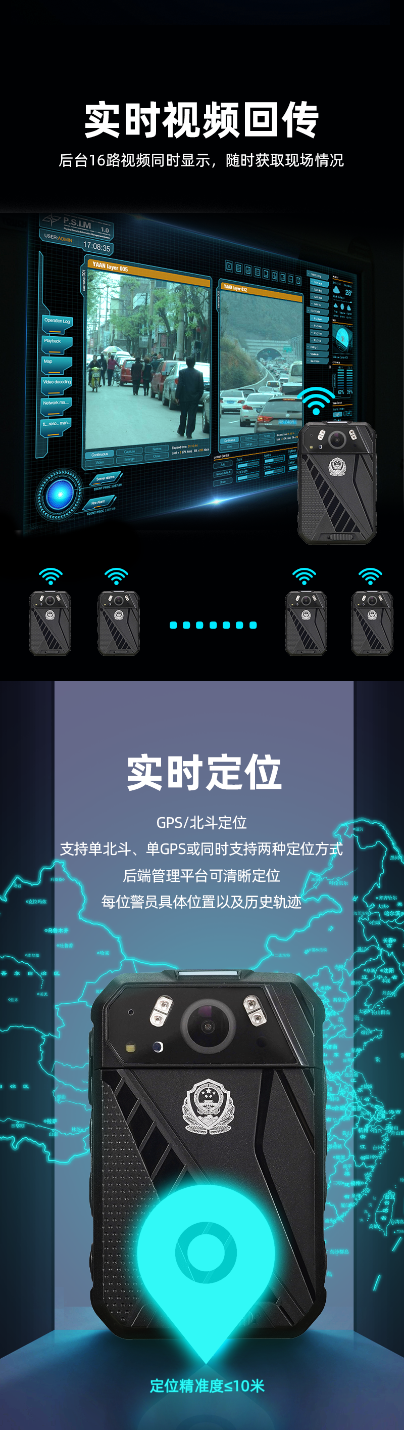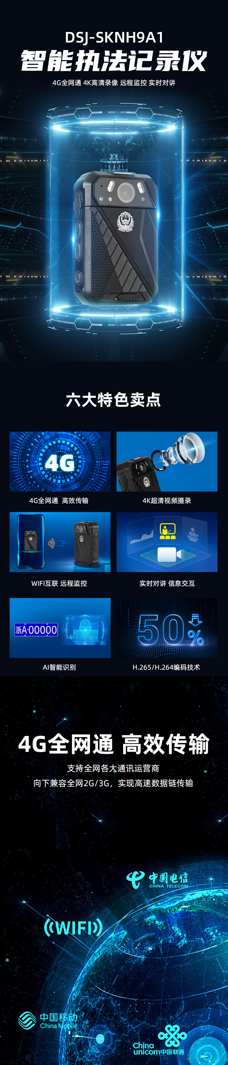 DSJ-SKNH9A1 4G执法记录仪,集高清视频图传、视频会议、语音集群调度、4G/WIFI、H.265编码、4K高清录像、蓝牙、SOS报警、NFC、指纹等模块,协同MCS8多媒体通讯系统平台实现针对移动式个体的远程调度指挥功能。GPS/北斗定位,支持单北斗、单GPS或同时支持两种定位方式。可广泛用于公、检、法、司、市监、税务、电力、铁路等部门。