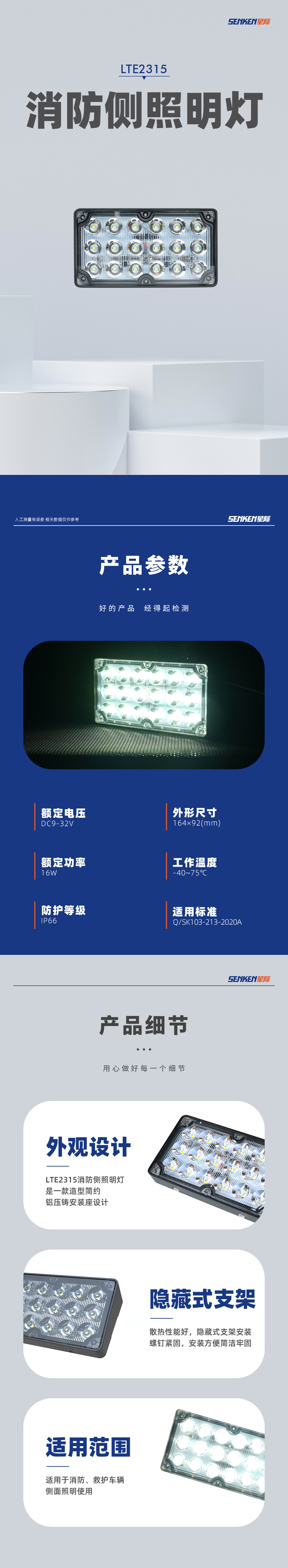 LTE2315消防侧照明灯是一款造型简约,铝压铸安装座设计,散热性能好,隐藏式支架安装,螺钉紧固,安装方便简洁牢固。适用于消防、救护车辆侧面照明使用。