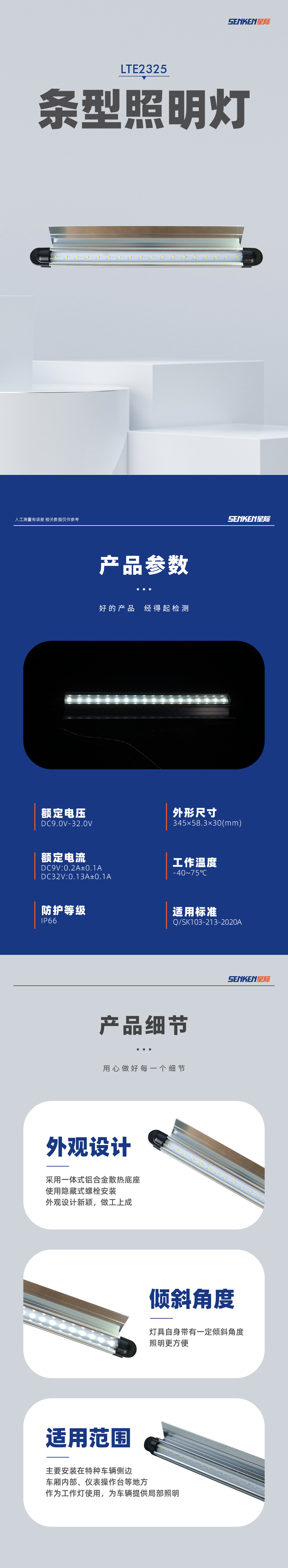 LTE2325照明灯采用一体式铝合金散热底座,使用隐藏式螺栓安装,外观设计新颖,做工上成,本产品主要安装在特种车辆侧边、车厢内部、仪表操作台等地方,作为工作灯使用,为车辆提供局部照明。