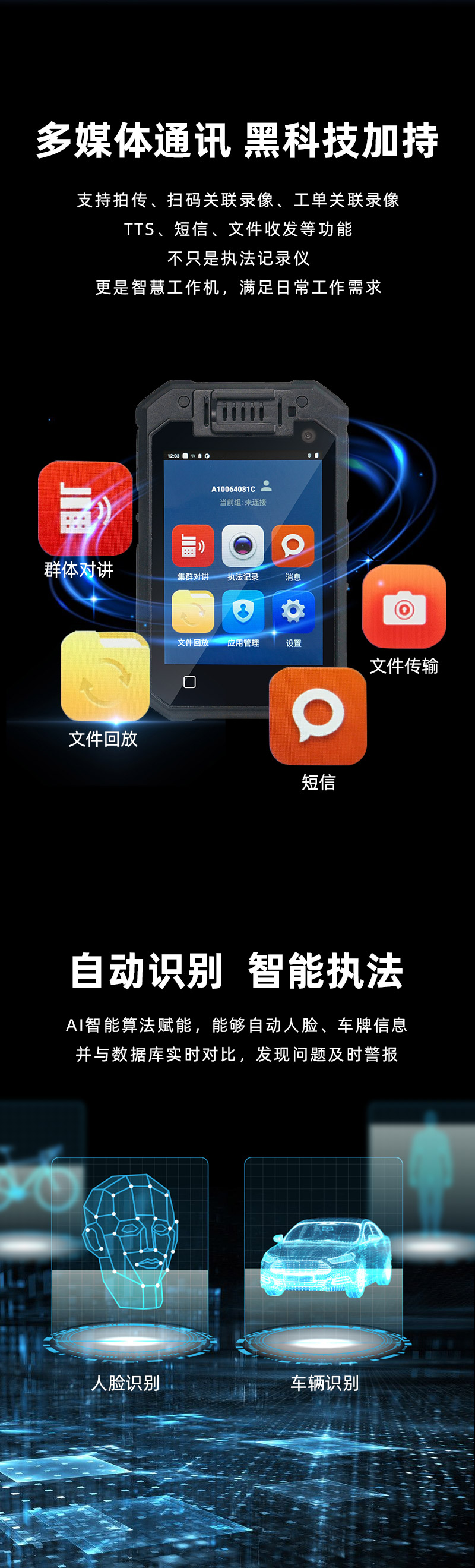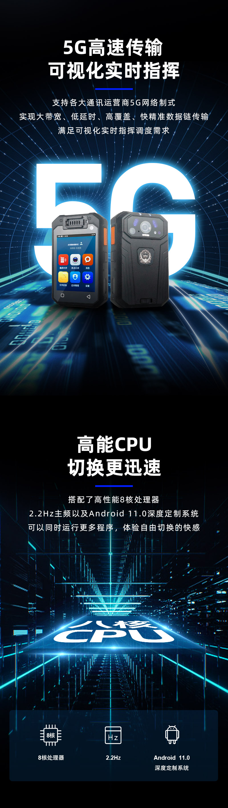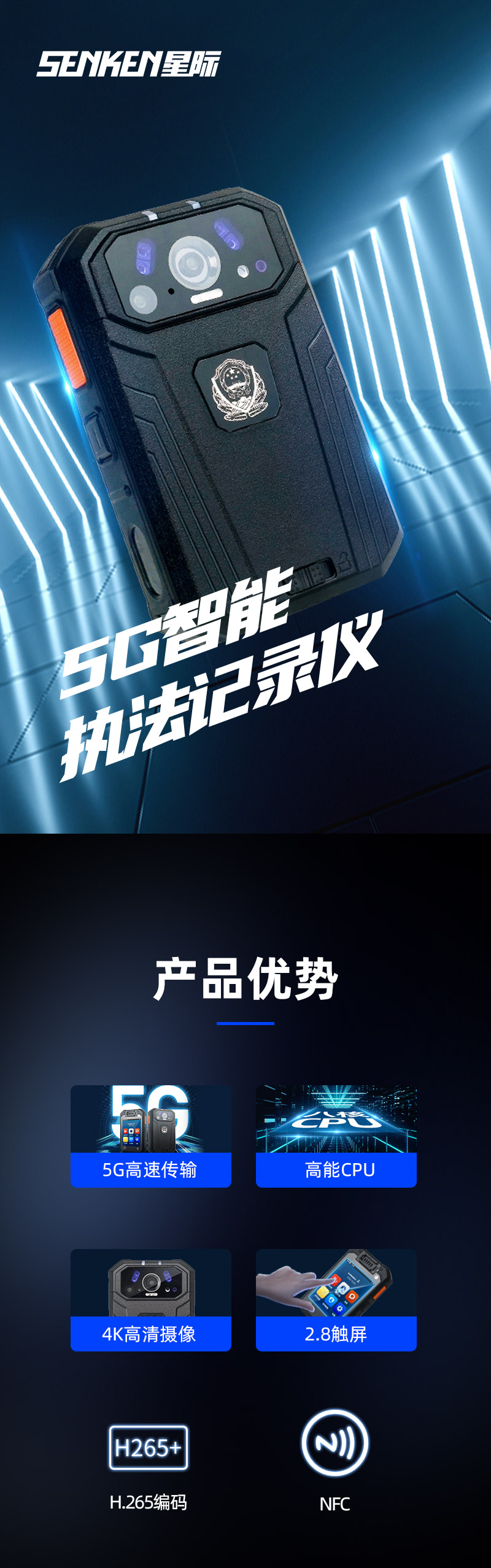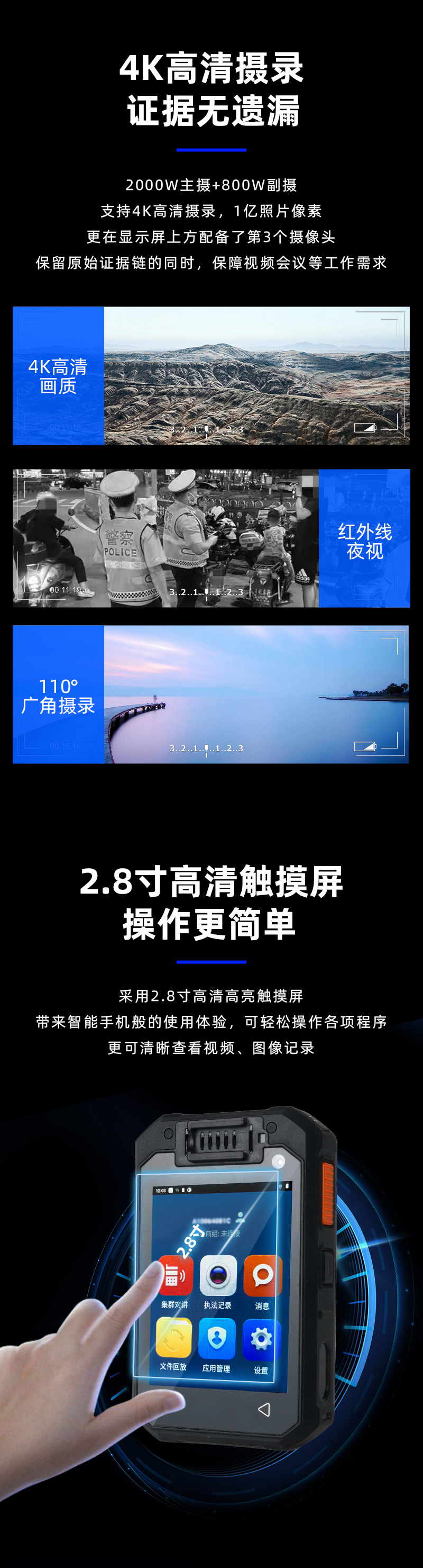 DSJ-V9是亚洲体育平台研发的新型5G智能执法记录仪,采用安卓10开放平台,低功耗,长续航。集高清图传、音视频会议、语音集群调度、5G/WIFI、H.265编码、4K高清摄录、蓝牙、SOS报警、NFC、指纹等模块,支持Onvif/GB28181协议接入第三方平台,也可协同多媒体通讯系统平台实现针对移动式个体的远程调度指挥功能。GPS/北斗定位,支持单北斗、单GPS或同时支持两种定位方式。可广泛用于公、检、法、司、保险、工商、税务、电力、铁路等企事业部门。
