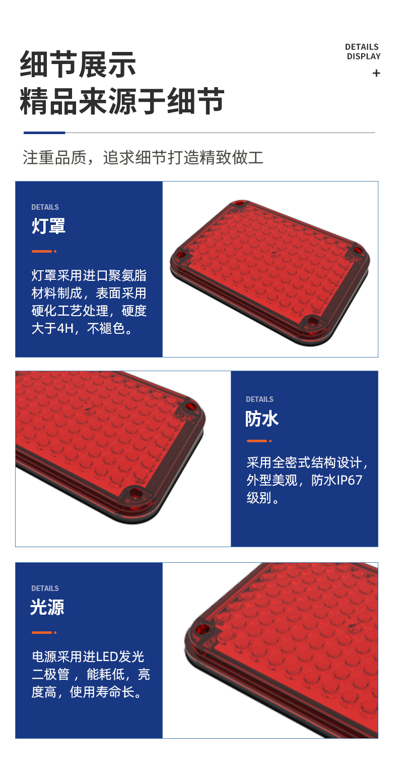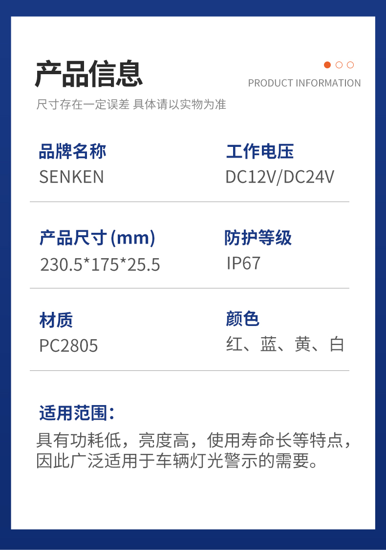 LTE515警示灯光源采用进口高亮LED发光管,使用寿命可达50000小时,且配以高透光灯罩,发光更高效,广泛适用于各种特种车辆四周照明警示。