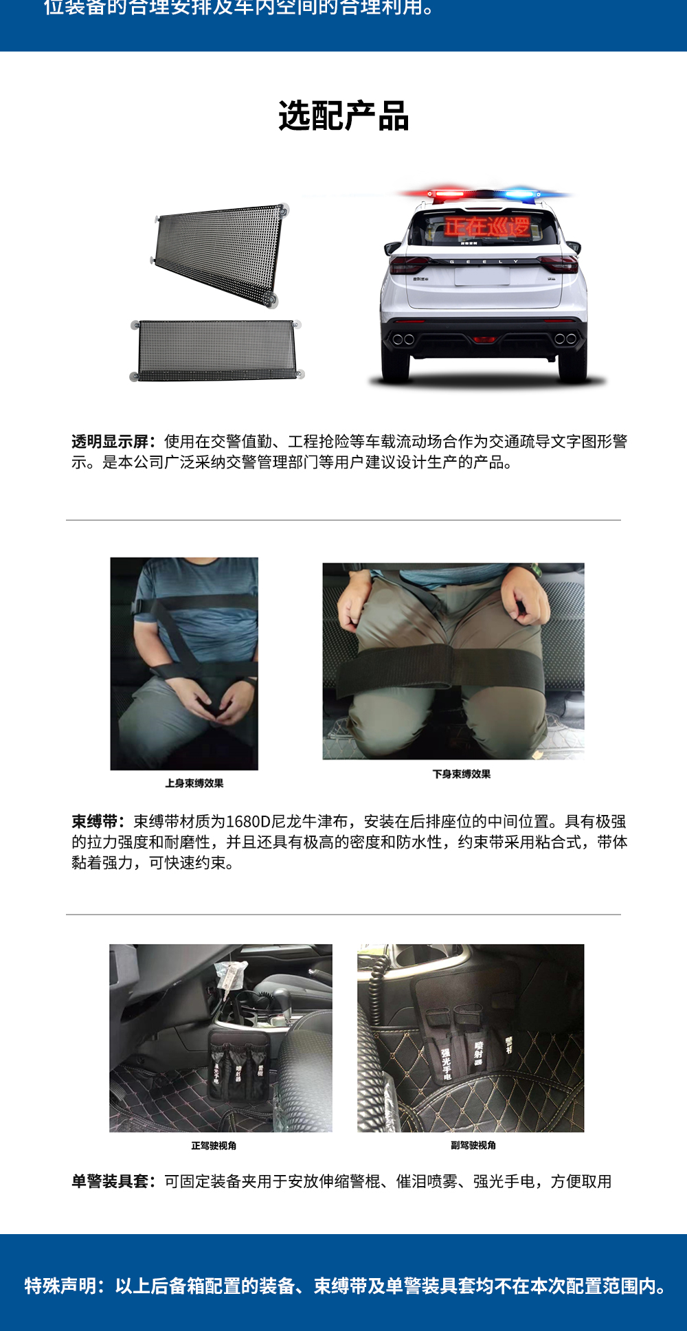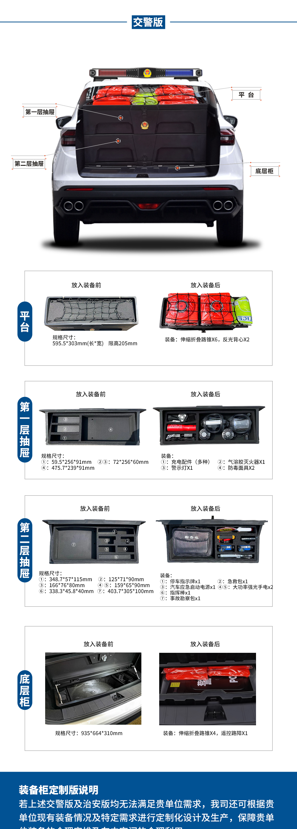 车载后备集成箱是一款实用型装备。可根据车型及客户所提需求产品来定制,实现所有装备整齐一体化,有效地提高执法警员实战装备需求和作战效率。 车载后备集成箱这种设备就是将警具装备进行规范的分类集中,可以同时满足警员执勤使用装备需要的便捷性、正确性以及规范性。还可以加强装备的日常管理,便于对车载警用装备的保护,同时降低装备在车辆行驶过程中产生的噪音。