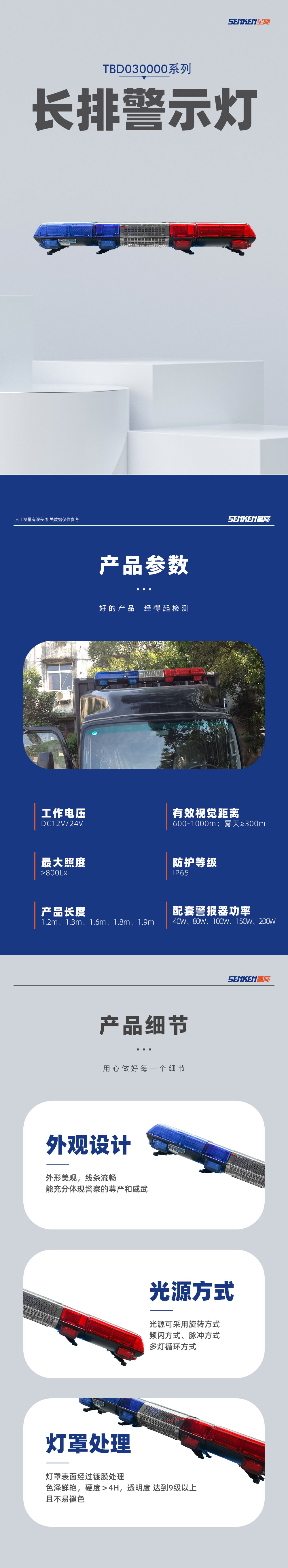 TBD03系列其外形美观、线条流畅,全部采用高亮LED光源,具有穿透能力强、功耗低、亮度高、使用寿命长等特点,并采用模块驱动,使性能更加稳定可靠 本系列产品灯罩采用进口聚碳酸脂材料,并采用先进工艺表面处理,从而使灯罩具有更高的透明度、更好的抗冲击力及不易褪色、抗划伤。采用多种灯光组合,使警示效果更加明显。