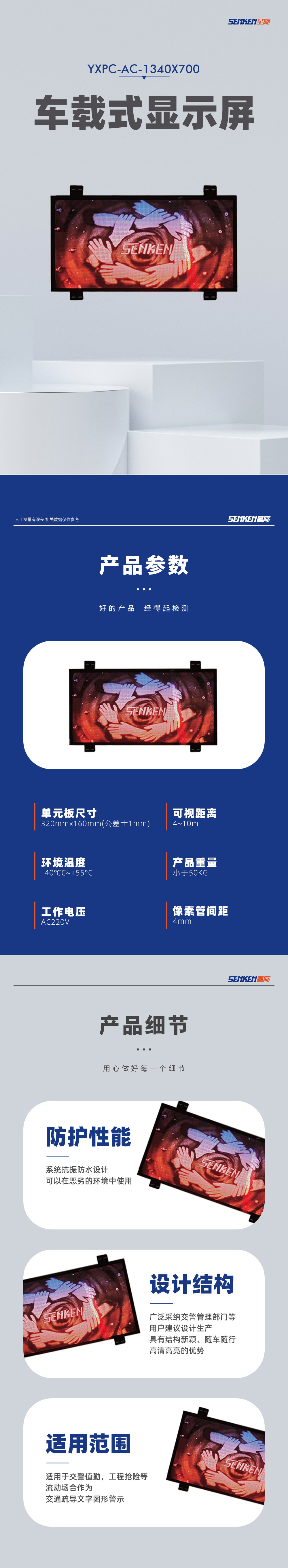 YXPC-AC-1340X700车载指挥显示屏是我司广泛采纳用户建议设计,具有结构新颖、随车随行、高清高亮的优势,适用于交警值勤,工程抢险等流动场合作为交通疏导文字图形警示。