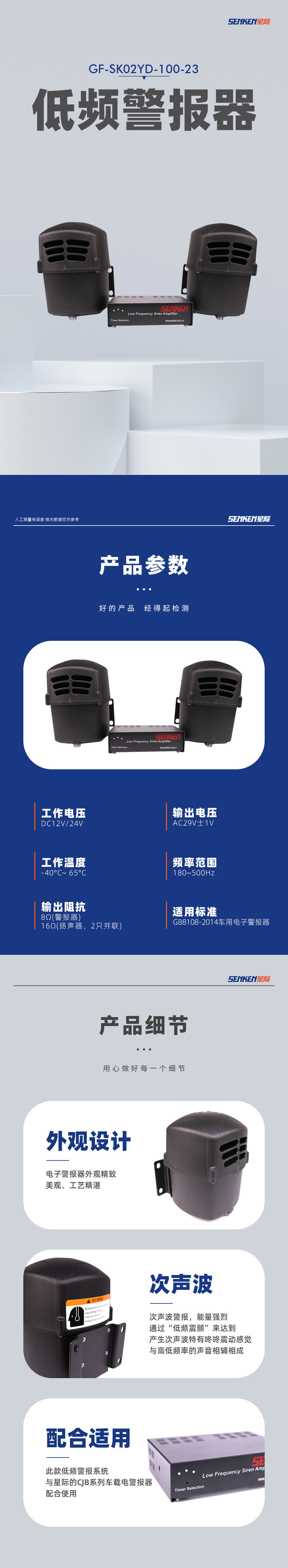 GF-SK02YD-100-23低频警报系统是我公司根据人耳的可闻音域范围量身打造的一款次声波警报,能量强烈。低频扬声器产生出“震人心脾”的低频声音,通过“低频震颤”来达到产生次声波特有的咚咚的震动感觉,同时与高低频率的声音相辅相成,会直接刺激到听到声音的人,让他们的身体产生下意识的感觉,察觉到特种车辆的到来,可适用于不同领域的特种车辆安装。
