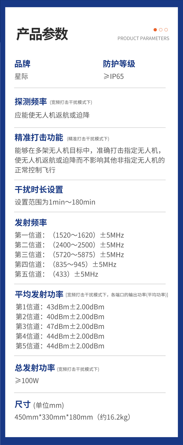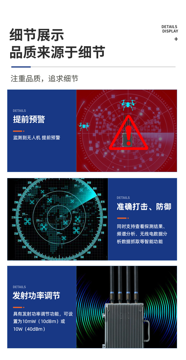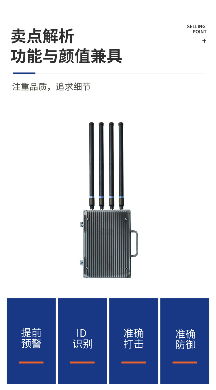 本无人机侦测反制系统是一款无线电无源自动探测、支持 360 °探测覆盖、标配2.4GHz/5.8GHz 频段(可选配 800MHz/900MHz)频段,具备超前预警、黑白名、ID 识别、精准打击、精准防御,同时支持查看探测结果、频谱分析、无线电数据分析数据抓取等智能功能。