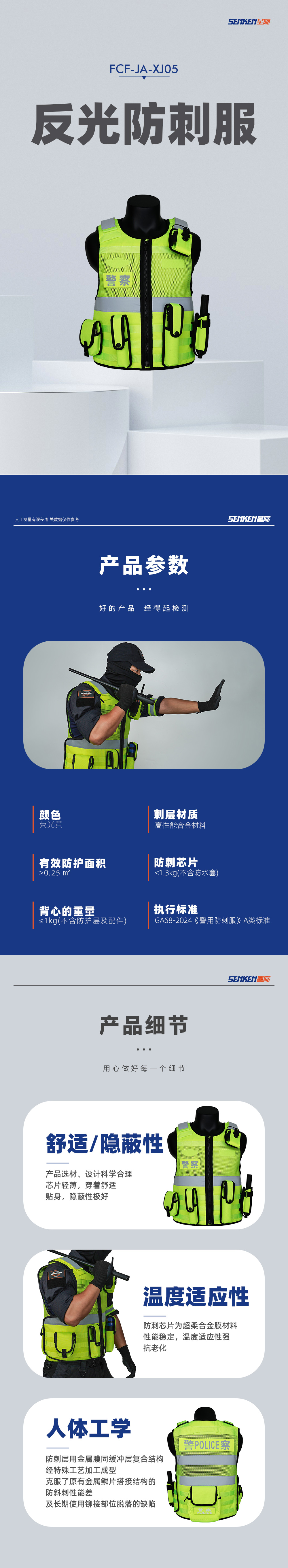 防刺服是由防刺外套、防刺层、防刺层保护套组成,防刺服材料无毒,对人体无自然伤害,穿着后没有使两臂的自由运动及人体跪、跳、蹲、俯仰、转体等动作受到限制。