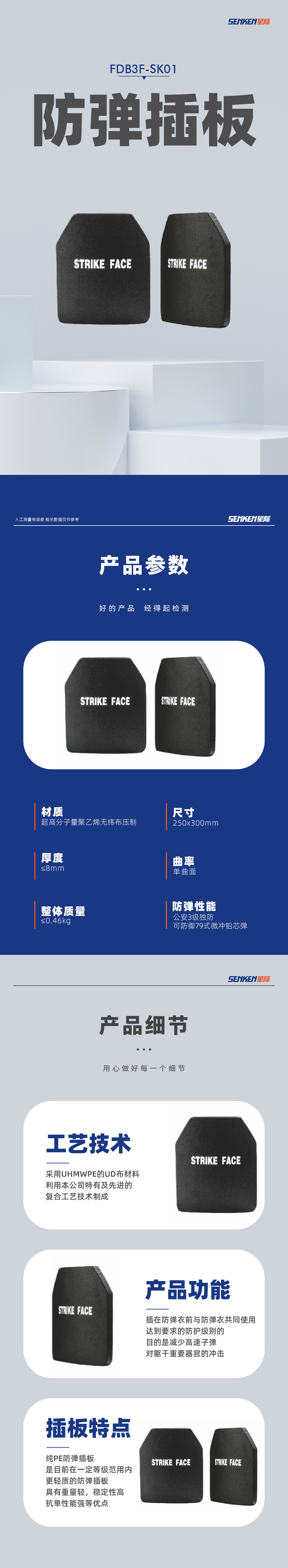 防弹插板应用主要在个体防护领域,通常是作为防弹衣的一个“配件”,加插在防弹衣前与防弹衣共同使用达到要求的防护级别的,目的是减少高速子弹对躯干重要器官的冲击。