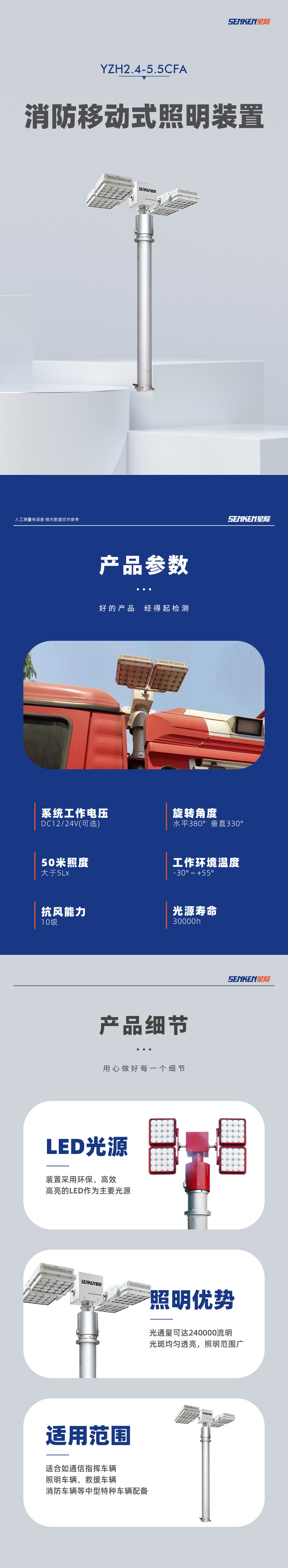 装置采用环保、高效、高亮的LED作为主要光源,光通量可达240000流明,光斑均匀透亮,照明范围广,适用于通信指挥车辆、照明车辆、救援车辆、消防车辆等中型特种车辆配备。