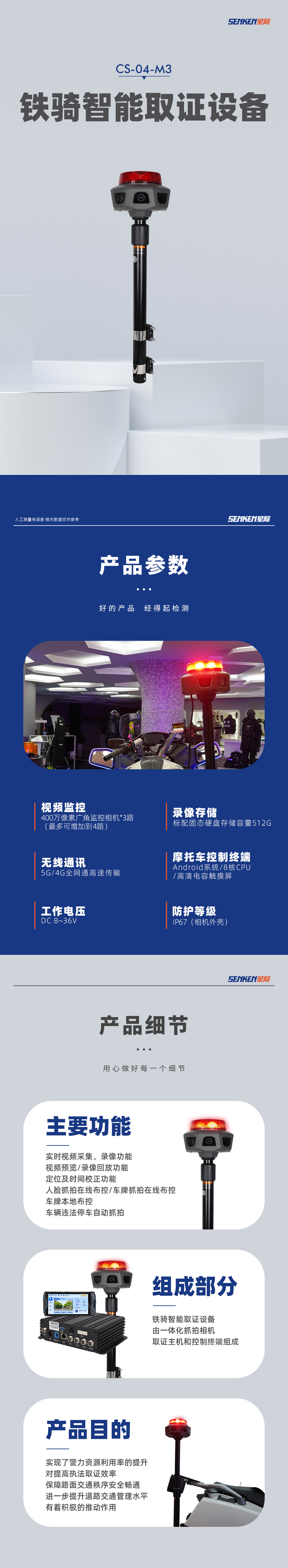铁骑智能取证设备是一款符合一线路面巡逻实战需要,并在外形结构、生产工艺、性能指标等全方位引领行业市场的高端产品。通过在警用摩托车上安装高精度、智能化、人性化的新型智慧执法取证系统,不仅能对道路上的车辆进行动态监管、智能取证,同时也能满足远程指挥,警力调度的需求。实现了警力资源利用率的提升,对提高执法取证效率,保障路面交通秩序安全畅通,进一步提升道路交通管理水平有着积极的推动作用。