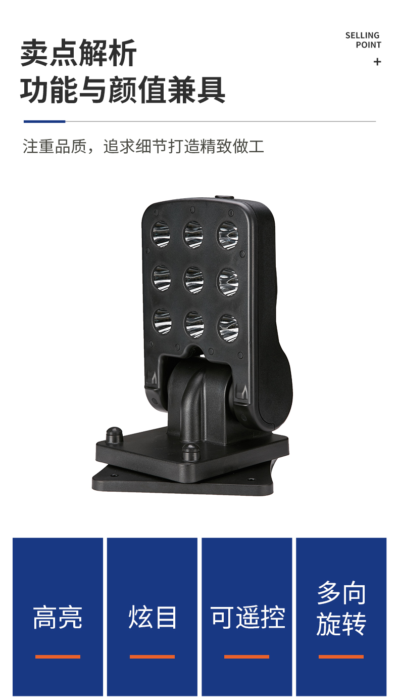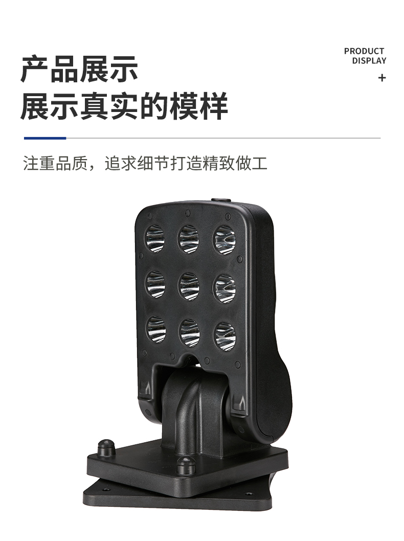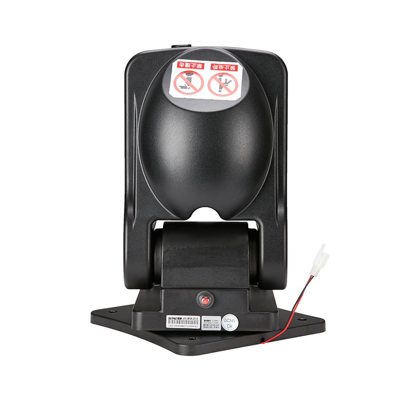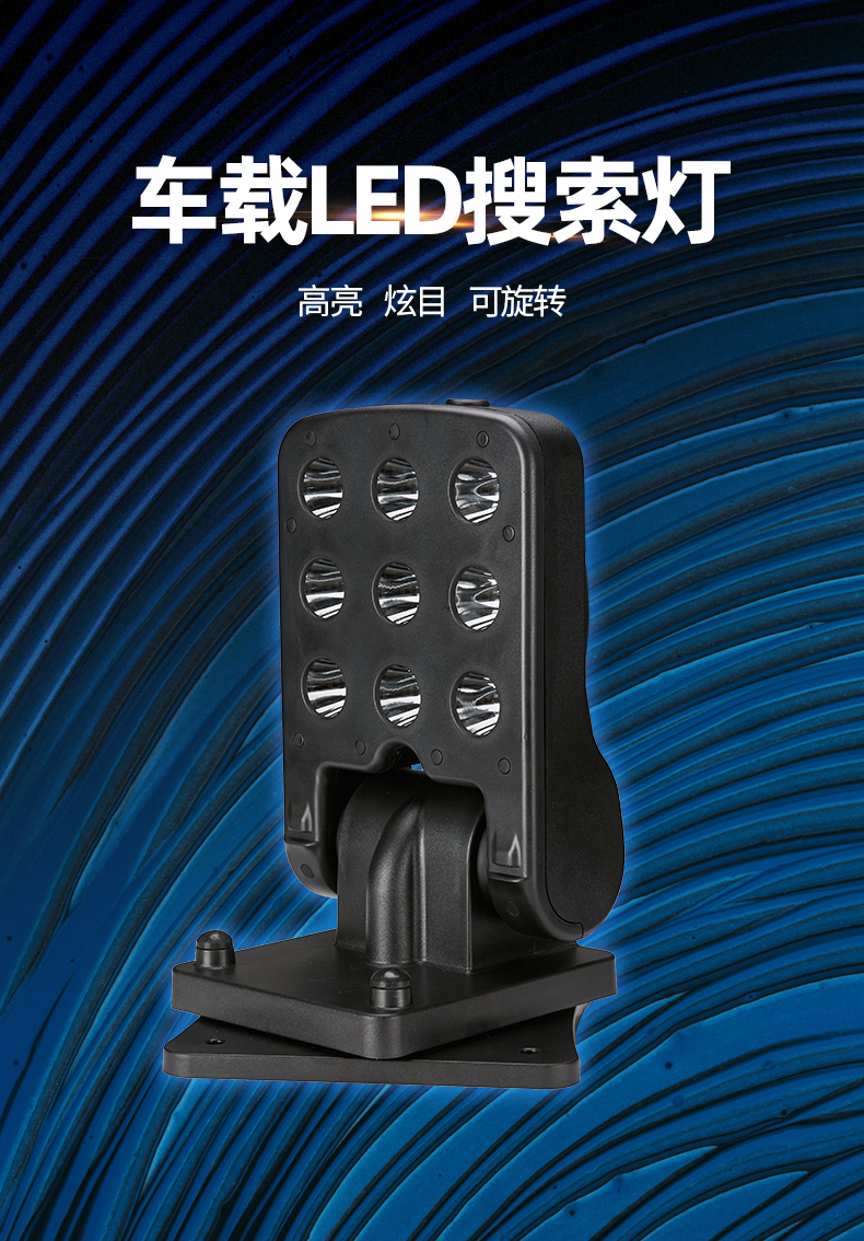 该产品为车载云台TY09与135T搜索灯的改进与简化版,增加了无限位水平旋转功能。 采用LED光源,并结合高聚光反光杯,实现强光照明功能。 附加眩目模式。电源满足车载电源标准(DC12V±10%),防护等级达IP65。 使用常规TK03遥控器控制,且可选配485总线控制方式。