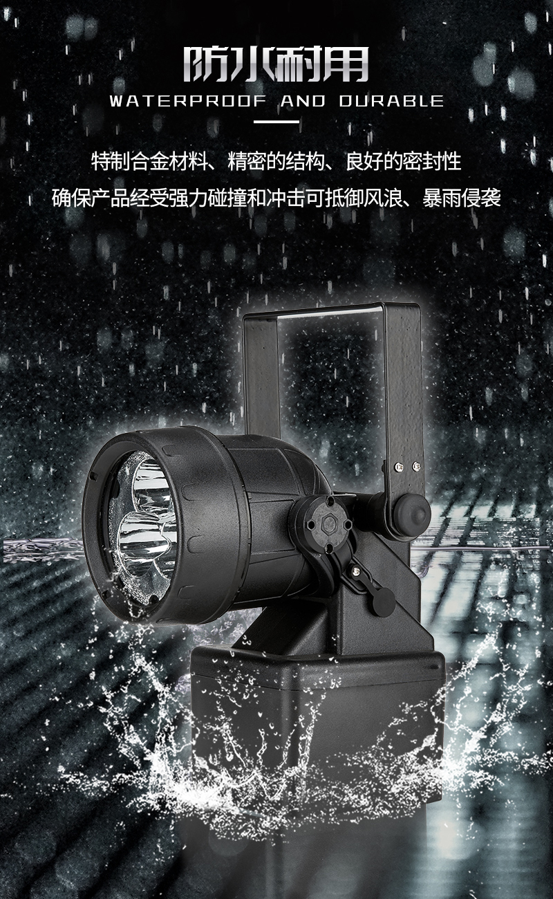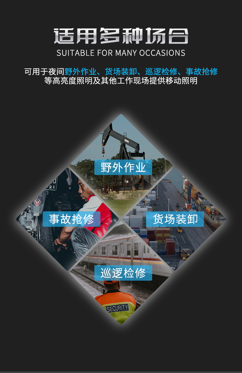 适用于铁路、电业、公安、油田、冶金、石化企业夜间野外作业、货场装卸、巡逻检修、事故抢修等高亮度照明及其他工作现场提供移动照明。