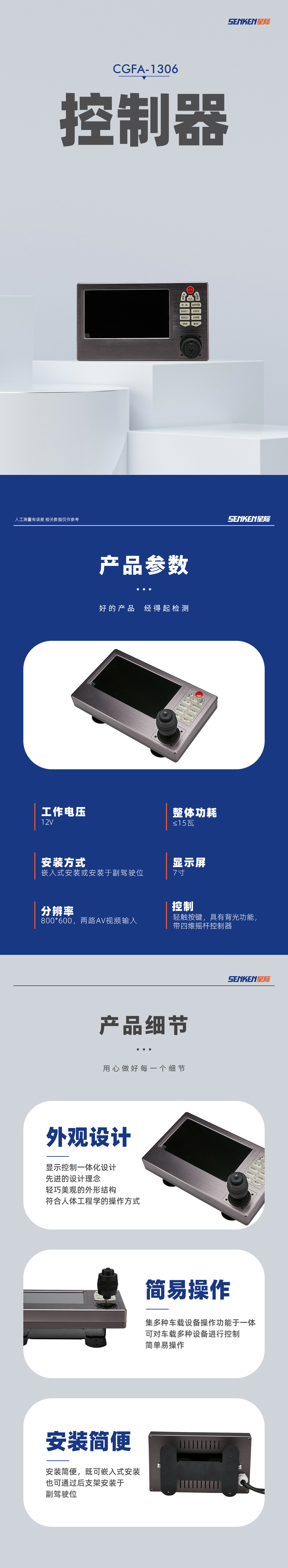 CGFA-1306控制器是为车载图像监控系统设计的一款控制面板,适用于多款车载监控系统,多种按键功能,可对车载多种设备进行控制,结构精美小巧,安装轻松方便,简单易操作,适用性强。