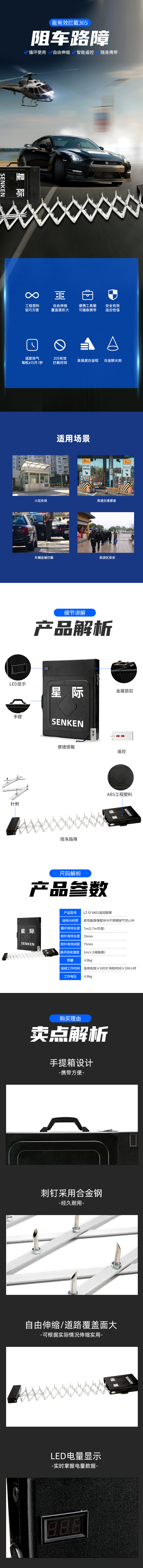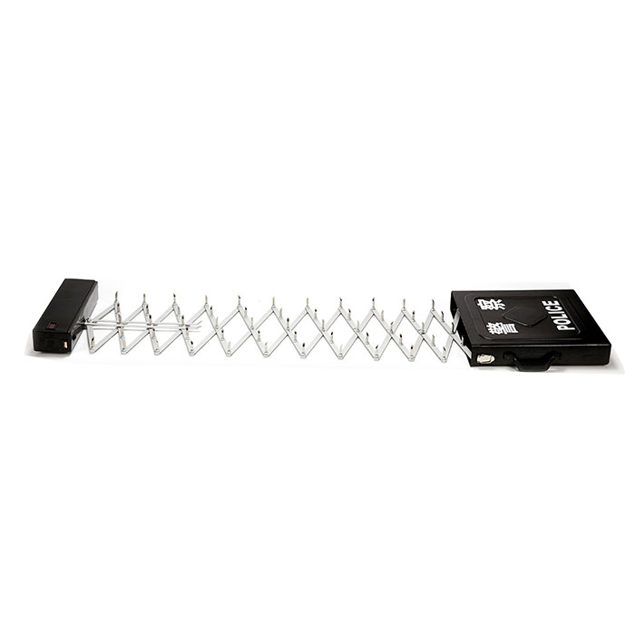 便携式遥控阻车路障由高性能增强塑块与不锈钢放气空心针组合而成,采用机电一体遥控装置,操作简单,安全可靠,可随时设卡,流动布防,不影响正常道路畅通,是有关执法部门需要设卡拦截疑犯车辆时不可缺少的先进装备。