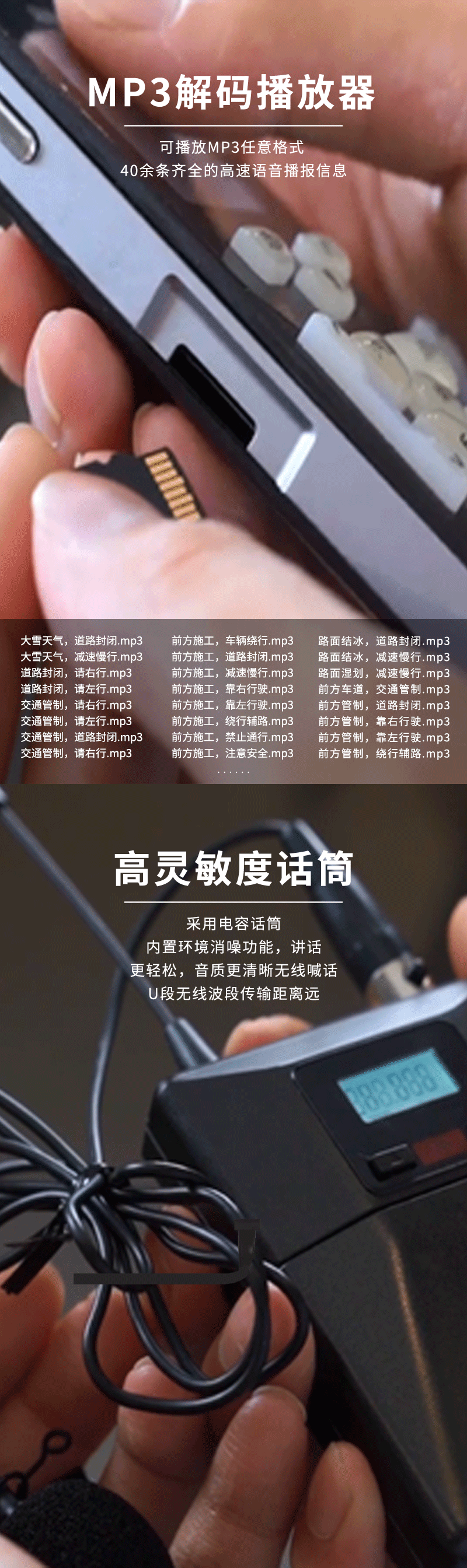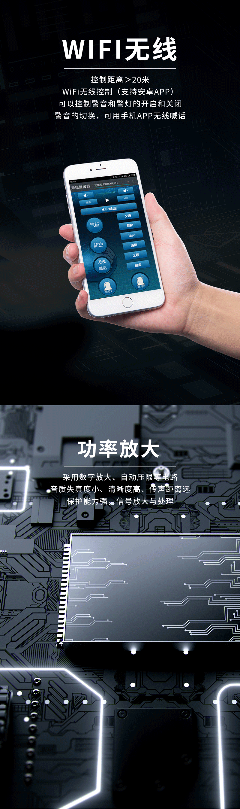 本扩音系统由功放主机、控制器、箱体、手柄控制器组成。采用硬件和软件相结合实现以下几种功能:一是多种警报音功能;二是无线喊话功能;三是灯控功能;四是混响功能;五是MP3歌曲播放功能。