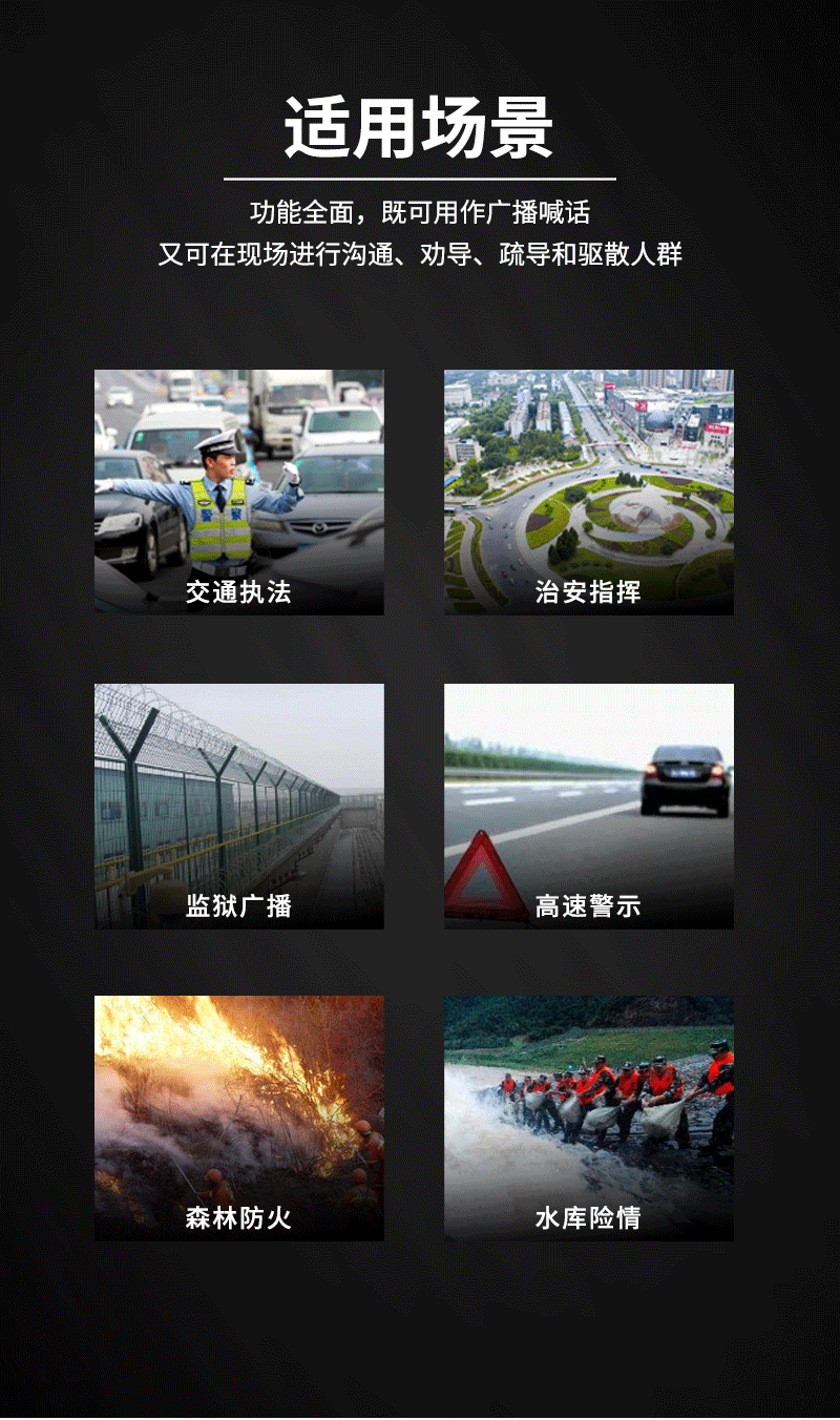 BX-150W便携式声光一体化扩音系统是我公司新开发的一款产品。它是在吸收国内外先进技术、工艺的基础上设计而成。配备免维护供电,300W、150W、100W可选式电声扩音系统;设计符合国家相应标准,运输方便。该产品主要可用于交通执法、交通预示、大型公安、治安等场所指挥;也可用于高速道路疏通、警示、预警及交通检查、森林防火、大型水库险情、监狱等场所作广播、警报设备之用(具体功能有所不同)。