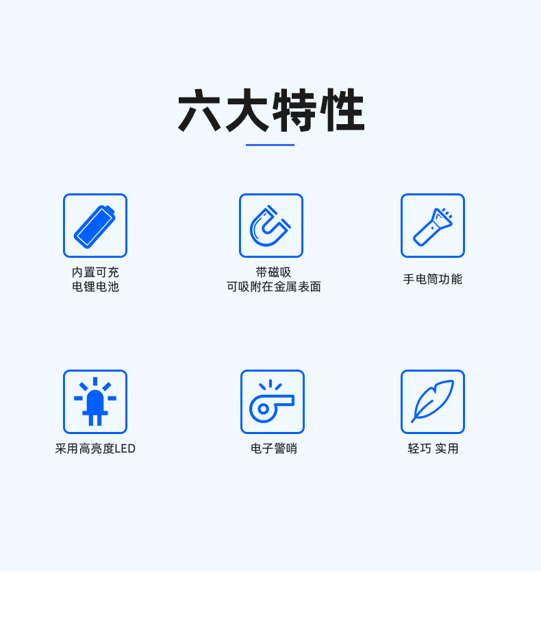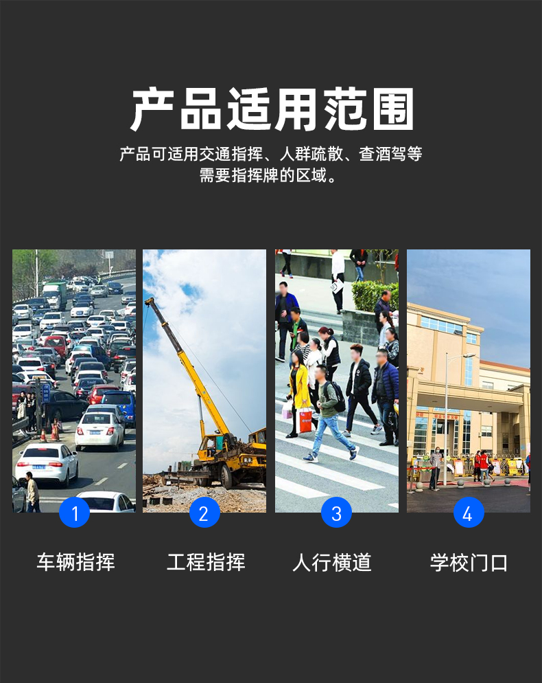 该产品是集声、光为一体的高效交通指挥工具。具有LED 交通指挥棒、大功率LED手电筒、电子警哨、磁吸等功能。可广泛应用于交通指挥、施工现场、设卡临检及一些特殊场所。