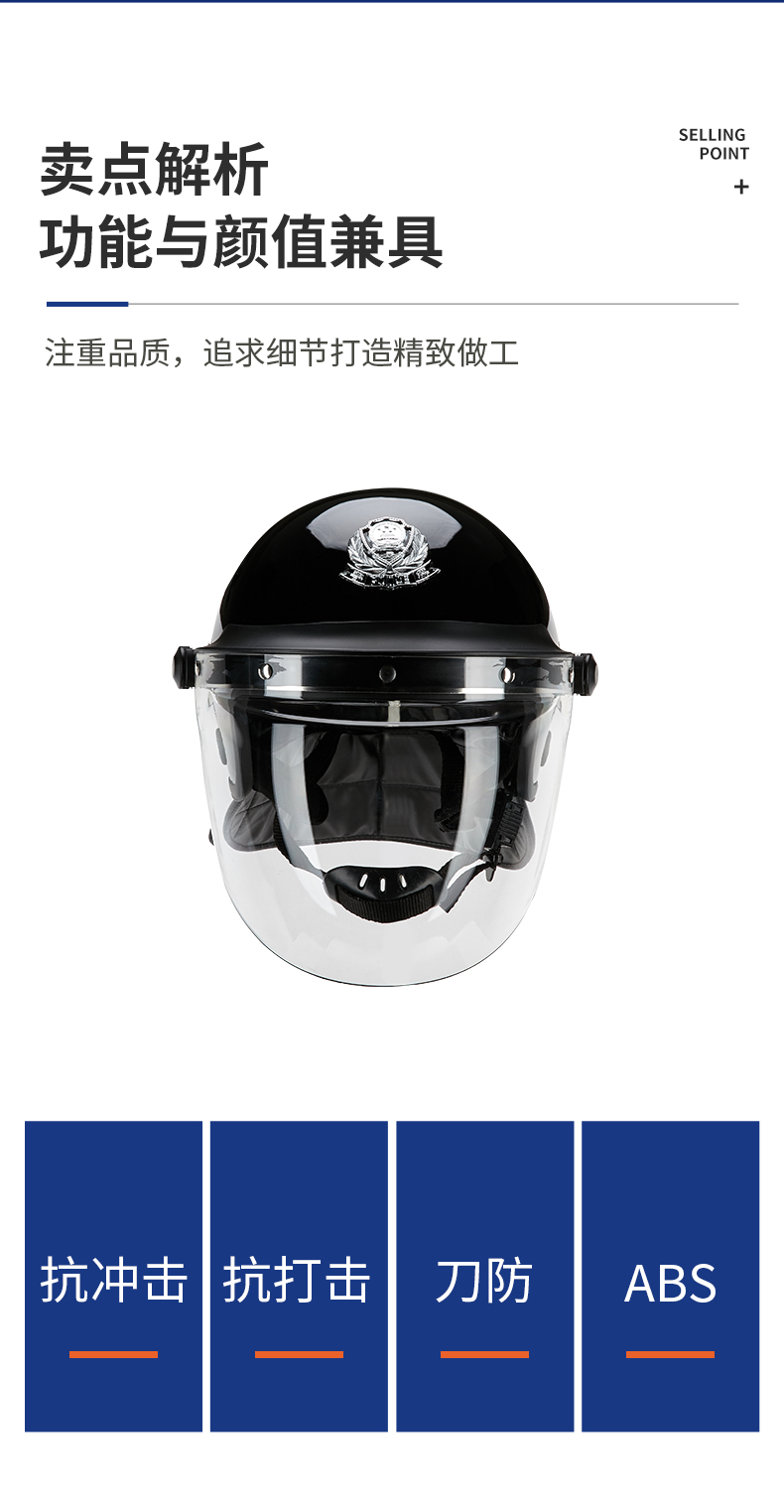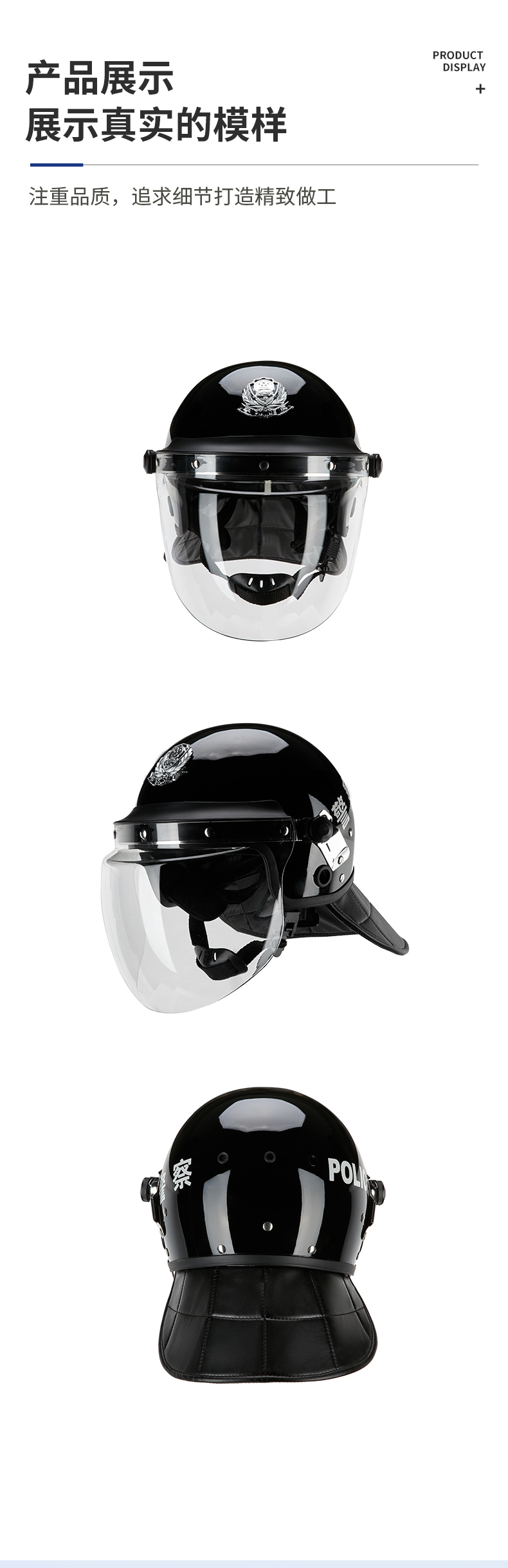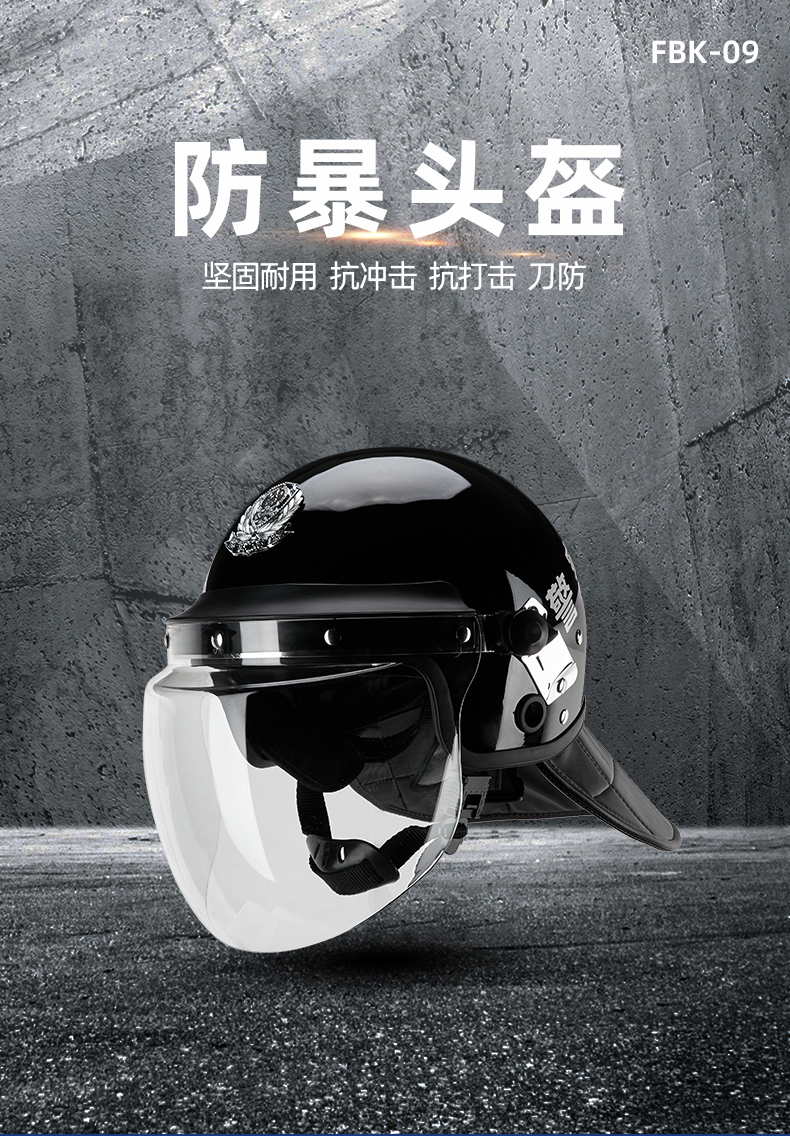 FBK-09警用防暴头盔是一种保护警务人员在执行公务时抵御头部及面部受到打击伤害或其它潜在的伤害(如泼洒腐蚀性化学液体)的一种警用装具。其壳体按公安部防暴头盔标准壳型设计,并采用 PC 合金制造,具有质轻、强度高,外形美观、线条流畅,面罩镜片透光率好,视野开阔、佩戴舒适、牢靠、穿脱简便等优点是警务人员在反恐反暴斗争中为保障自身安全必备的防护用品。