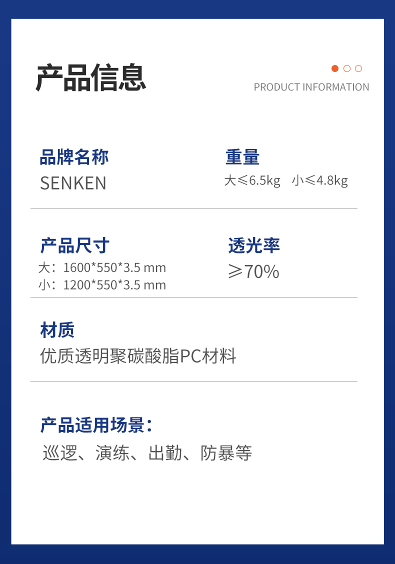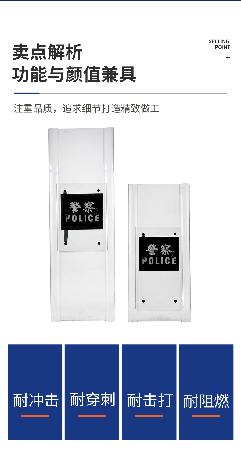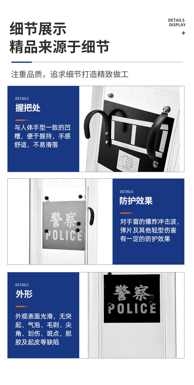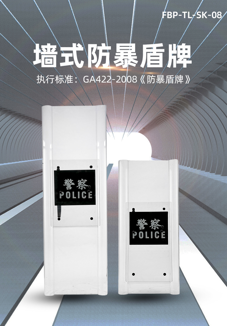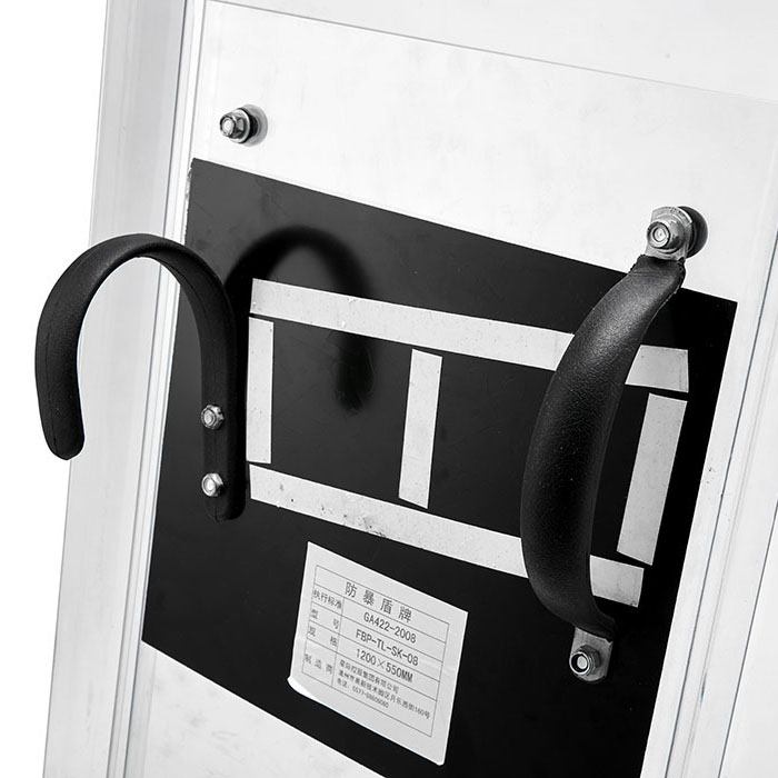 FBP-TL-SK-08组合式防暴盾牌是我公司开发的新型盾牌,由1600×3.5×550和1200×550×3.5两块组成。大块作为正面防护,小块下端搁在大块上端处,为人体头顶方向防护。如同单人傍“亻”形状。多个组合式防暴盾体可利用宽度两端成型的半圆沟,进行相互衔接,形成一排盾牌墙。每套组合由两人,一前一后同时操作。盾牌墙抵御外来刀、棍、棒、石头等袭击,有效掩护身后人员的前进、撤离和阻拦对方的突进等等。