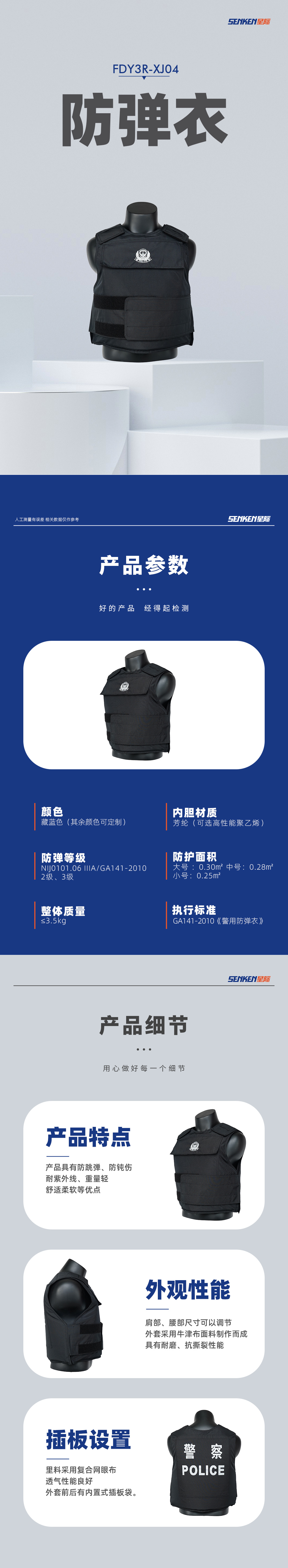 该款防弹衣采用背心穿套设计,肩部、腰部尺寸均可调节,满足不同体型穿着需求。内胆采用芳纶材料,相较于金属材料,更柔软舒适,且质量更轻,长时间穿着也不会觉得负担。同时,防护性能强,防弹性能可达标准3级。广泛适用于公安民警、安保、医护等人群。