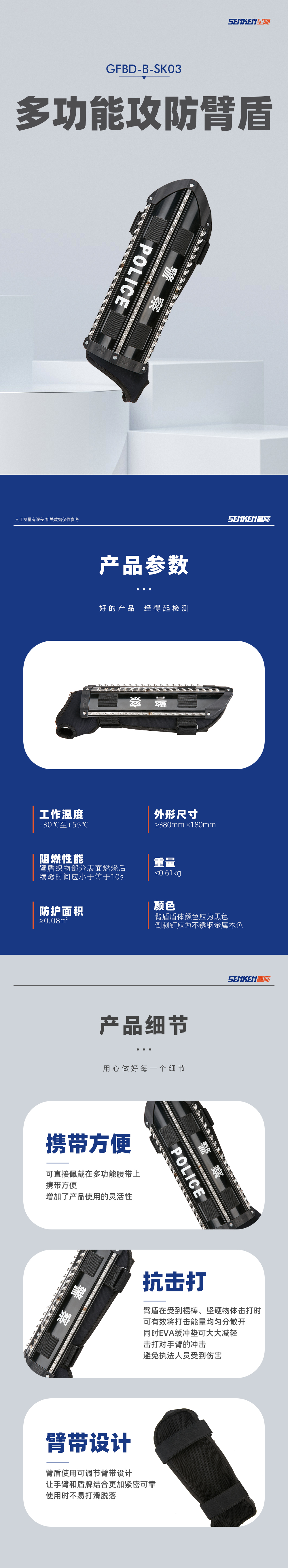 多功能攻防臂盾轻便、灵活、便捷,可提高警员的攻击与防御能力。该多功能攻防臂盾在老款产品的基础上增加了防护面积,优化了机械结构,使该臂盾具有更高安全性,舒适性及适用性,为警员出警多增加了一份安全保障,同时优化了外形设计,使该臂盾更坚固美观。