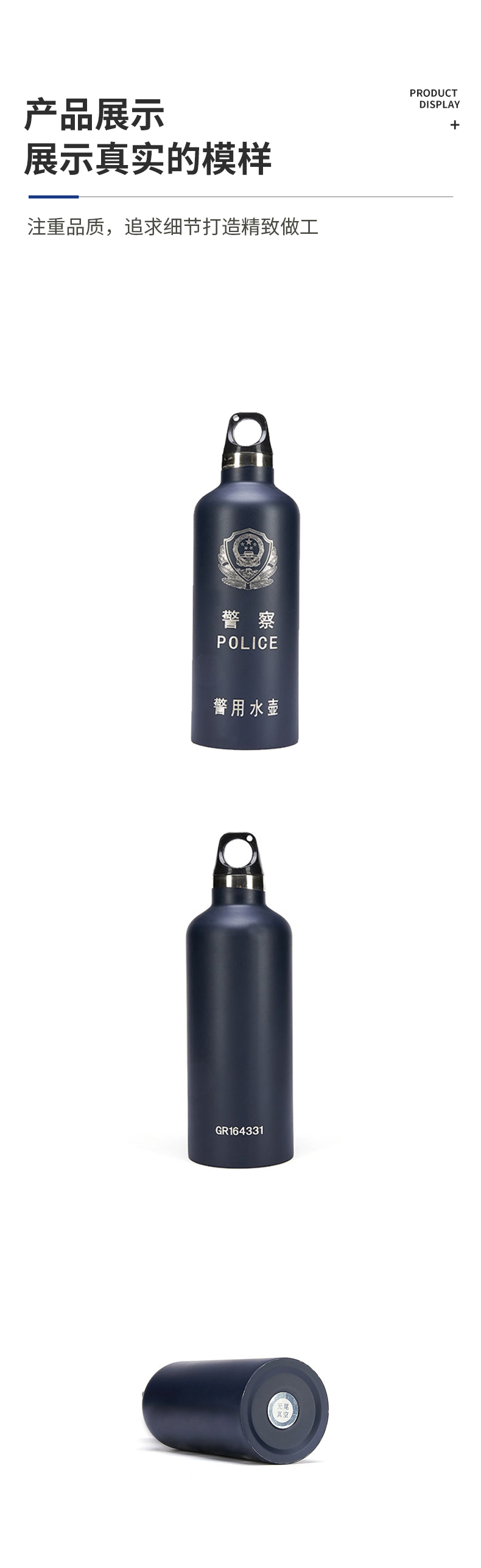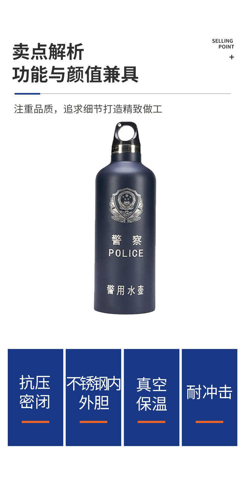 警用水壶采用304不锈钢内、外胆,抗压密闭,符合GA887-2010《警用水壶》执行标准,具备真空保温、耐摆动冲击、抗坠落冲击性能。