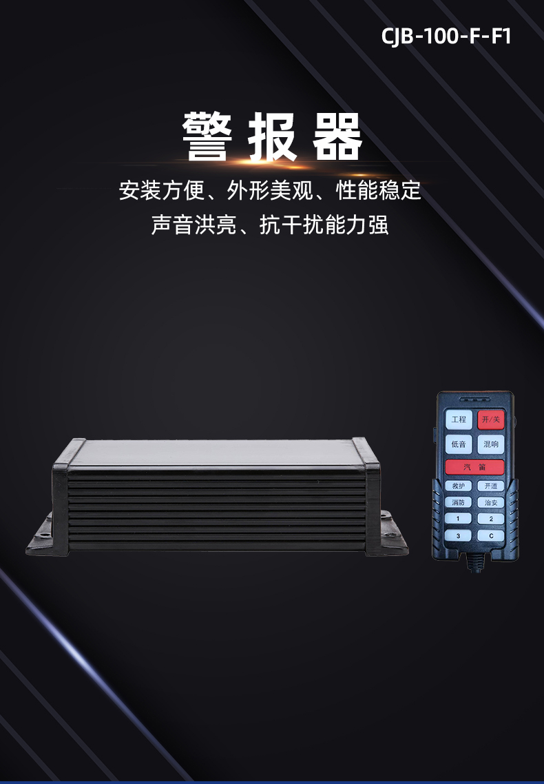 CJB-100-F-F1是一款外观精致、美观、工艺精湛的分体式电子警报器,可以在座椅下或者狭窄空间安装,控制器表面UV硬化,持久如新