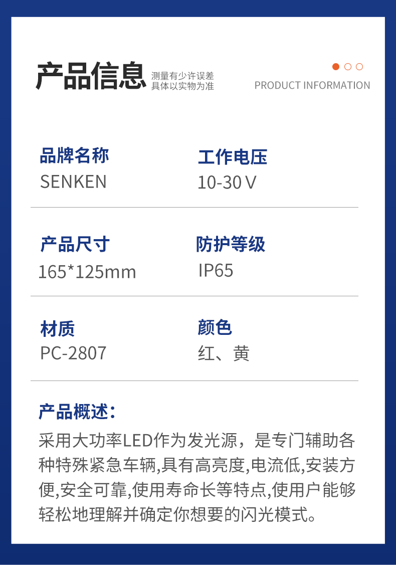 LL103采用大功率LED作为发光源,是专门辅助各种特殊紧急车辆,具有高亮度,电流低,安装方便,安全可靠,使用寿命长等特点,使用户能够轻松地理解并确定你想要的闪光模式。
