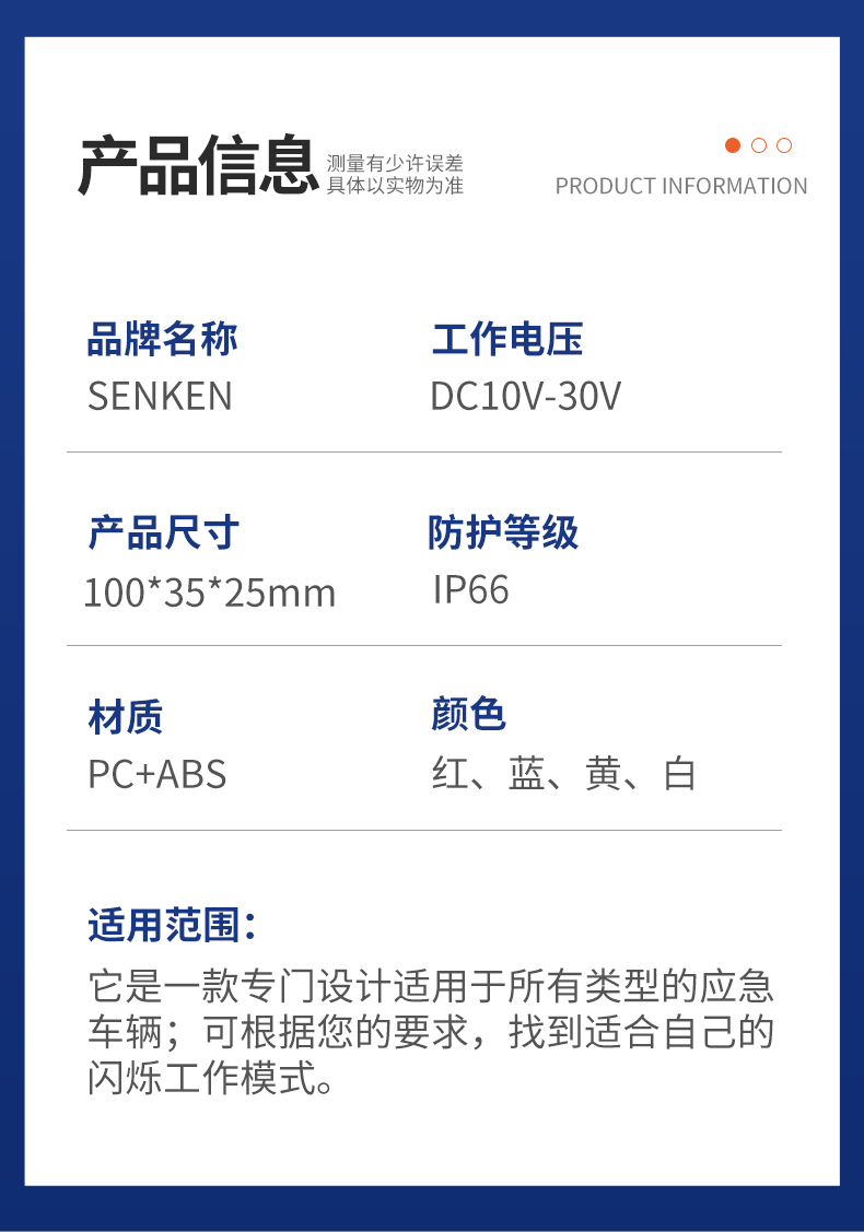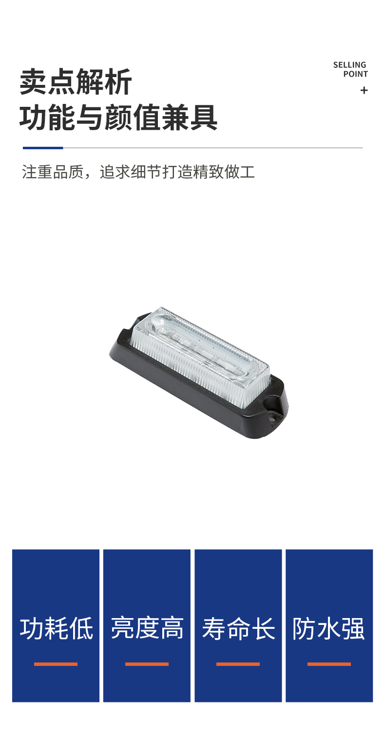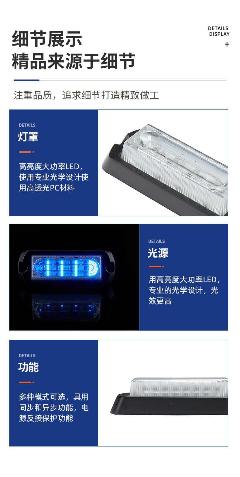 该产品采用大功率LED,使用寿命长。独特的外观设计,光源结构紧凑,操作方便,有多种闪光模式;它是一款专门设计适用于所有类型的应急车辆;可根据您的要求,找到适合自己的闪烁工作模式。