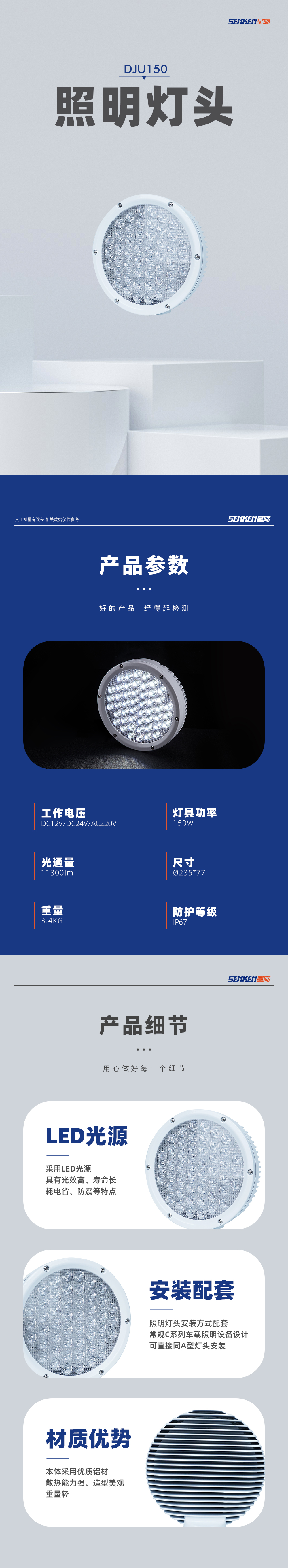 DJU150照明灯头是专业为车载照明设计,适合车载、夜间应急照明使用,采用国际领先的设计理念和制造工艺,选用了国际新LED作为主光源,灯具光学由专业光学团队专利设计,本体采用优质铝材,散热能力强、造型美观、重量轻。