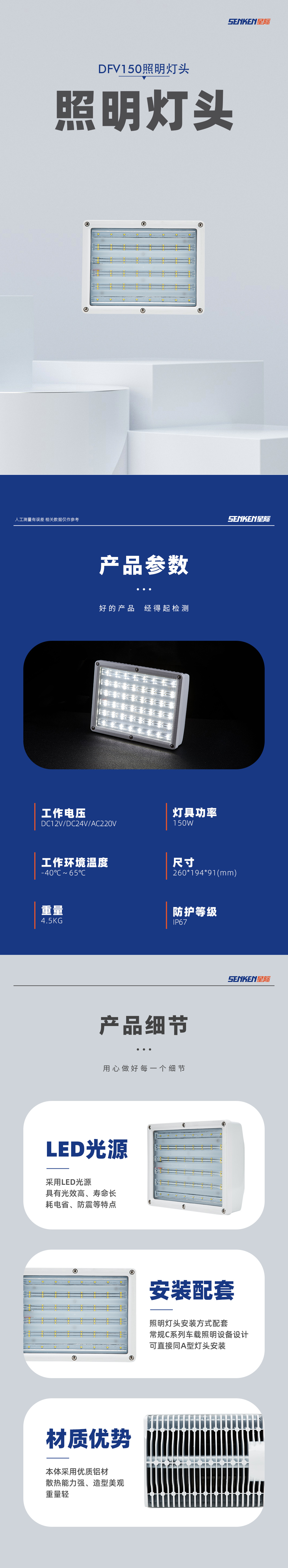 DFV150照明灯头是专业为车载照明设计,适合车载、夜间应急照明使用,采用国际领先的设计理念和制造工艺,选用了国际新LED作为主光源,灯具光学由专业光学团队专利设计,本体采用优质铝材,散热能力强、造型美观、重量轻。