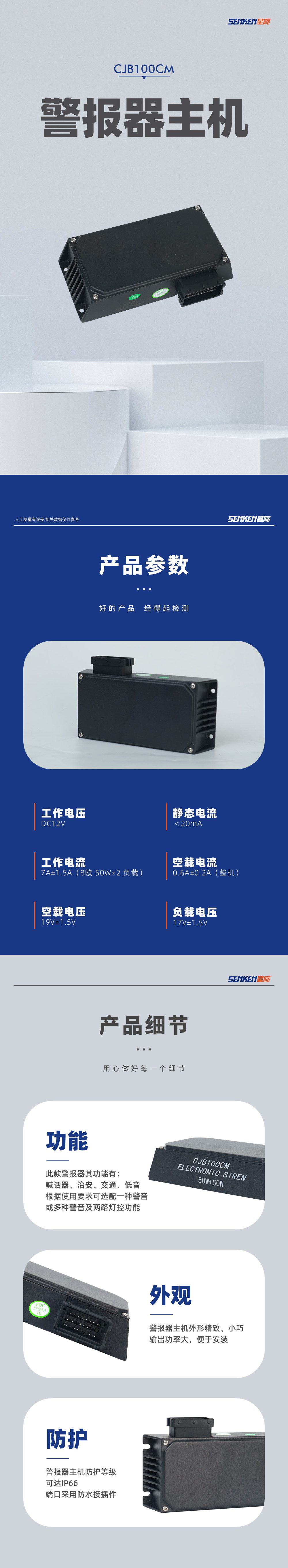 此款警报器其功能有:喊话器、治安、交通、低音,根据使用要求可选配一种警音或多种警音及两路灯控功能。