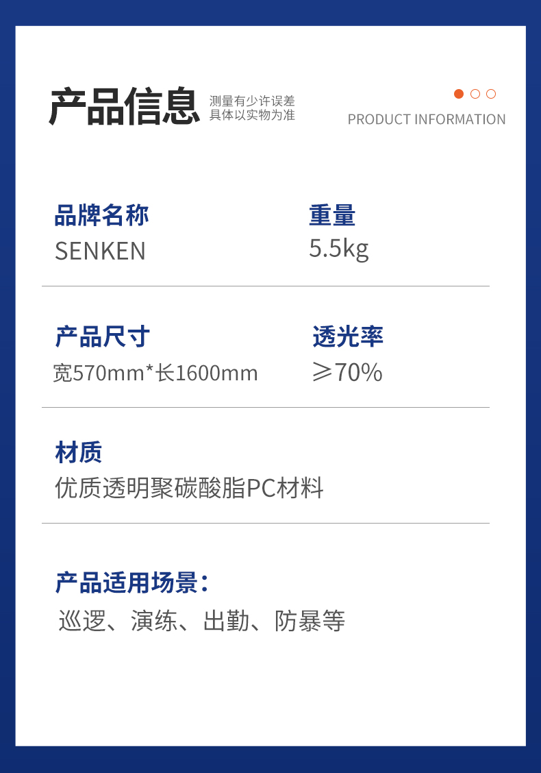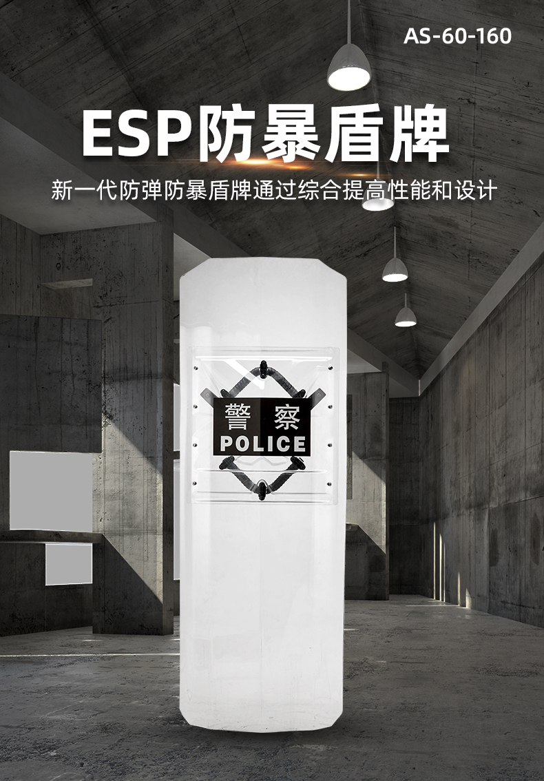 新一代防暴盾牌采用耐用的聚碳酸酯制成,通过综合提高性能和设计,在持续的暴力冲击过程中,能抵挡滑膛枪发射3mm的散弹,也能防御瞬间汽油燃烧弹所带来的高温灼伤的危险,筑起安全防护的持久防线。同时,盾牌背部的加强板可有效降低双手的冲击与振动,盾牌的V型面设计亦可有效化解各个方面过来的重击。