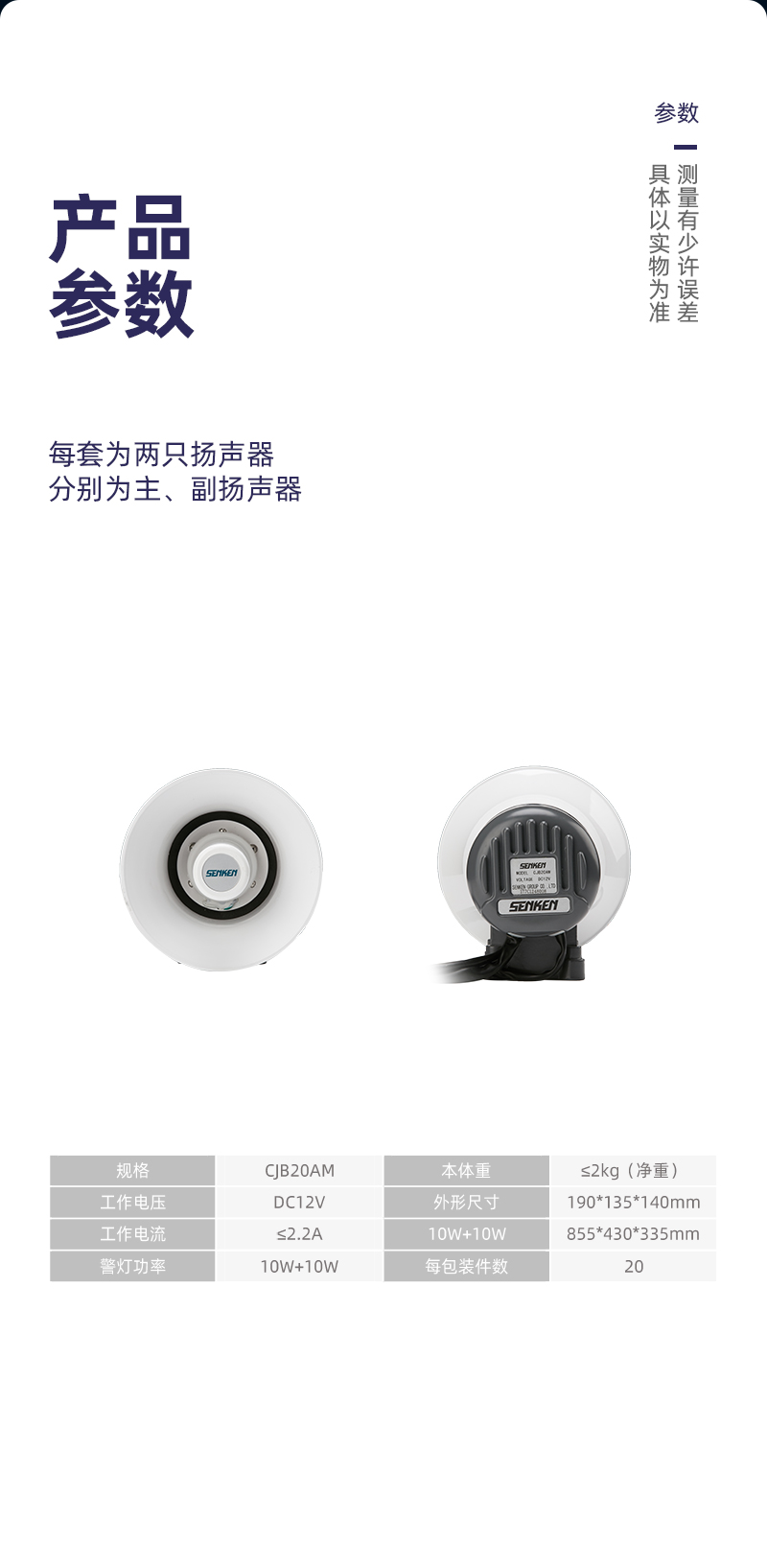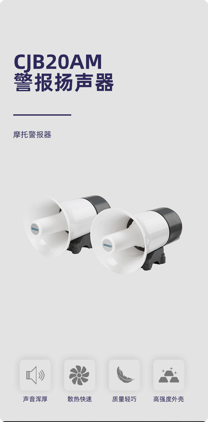 CJB20AM警报扬声器采用高强度外壳,质量轻、耐腐蚀、不易褪色,同时具备大功率、音质好、失真度小等优势,可适用于各种车型。